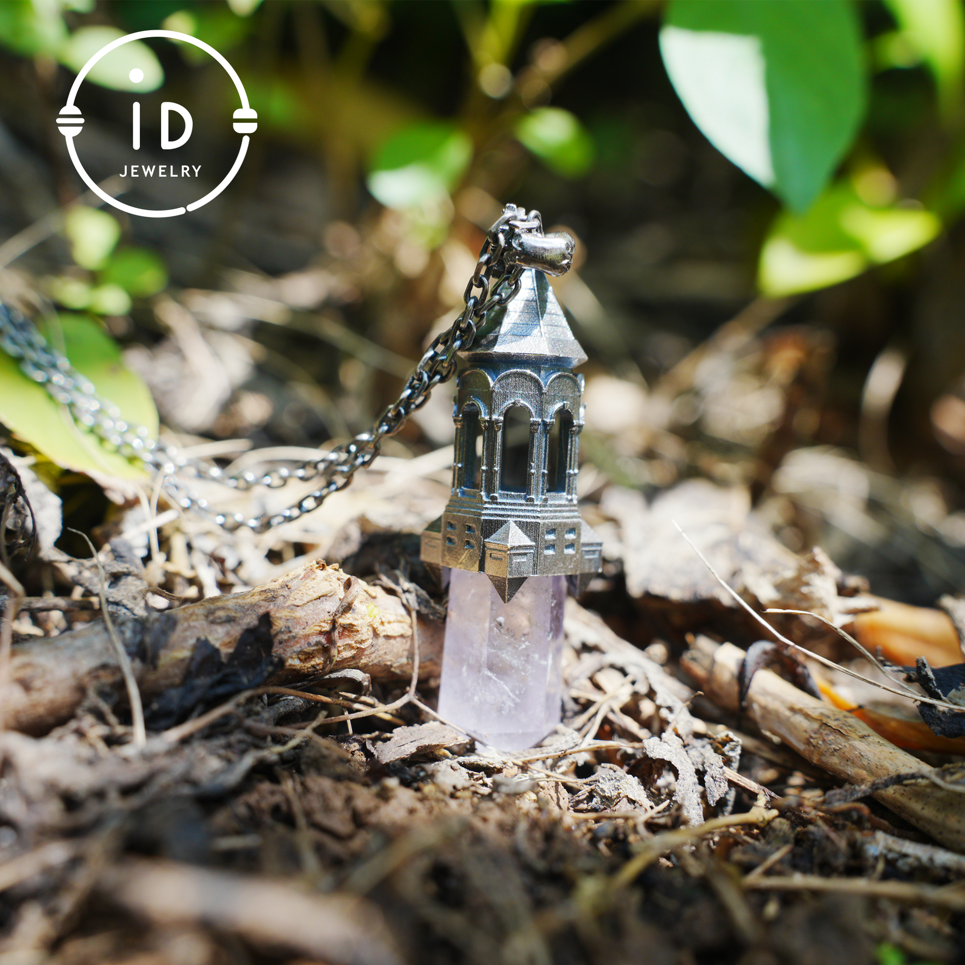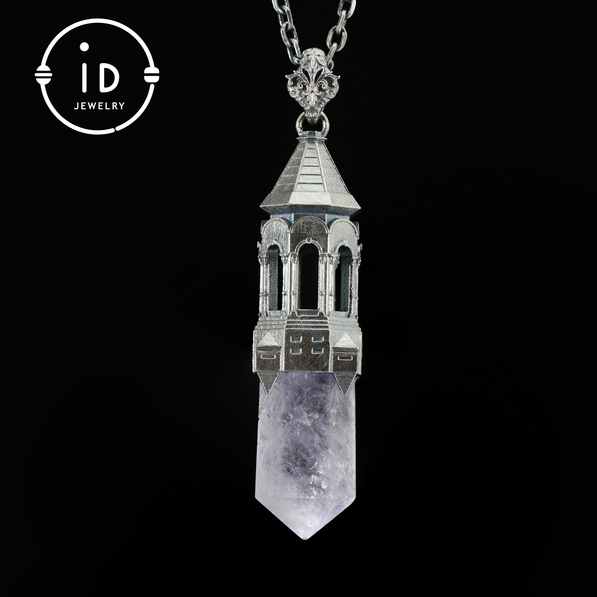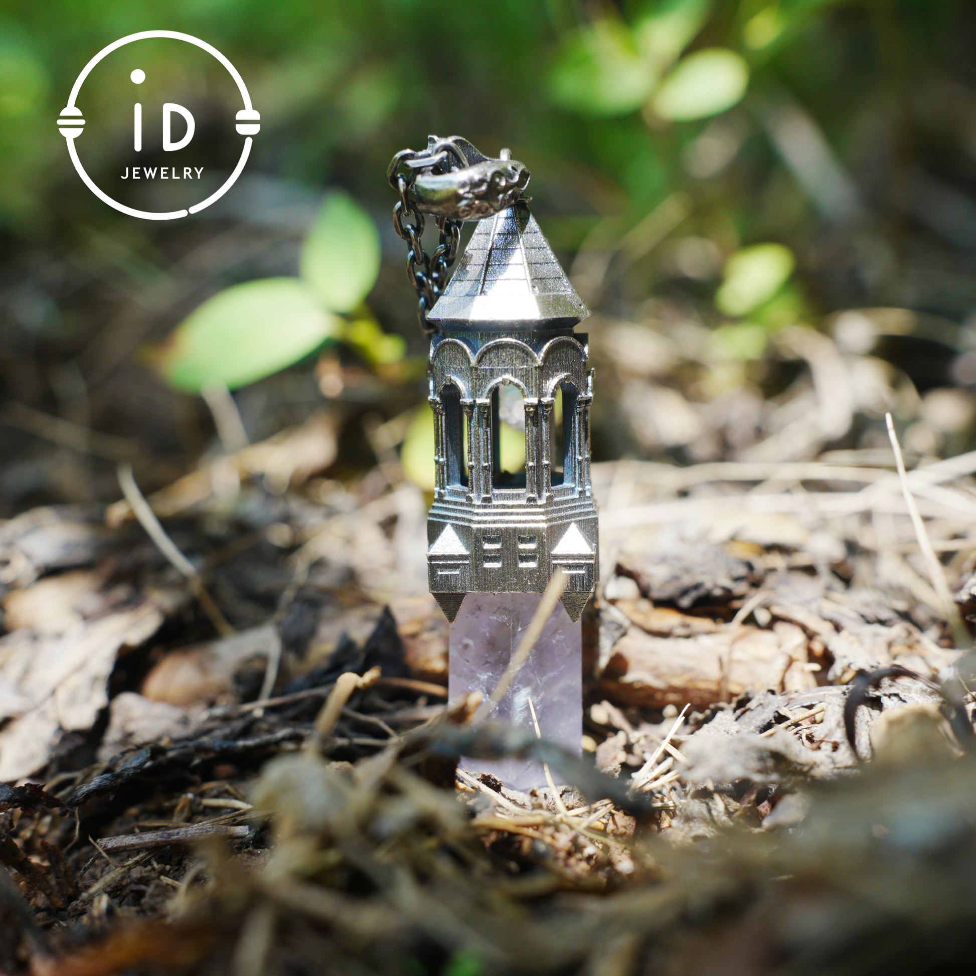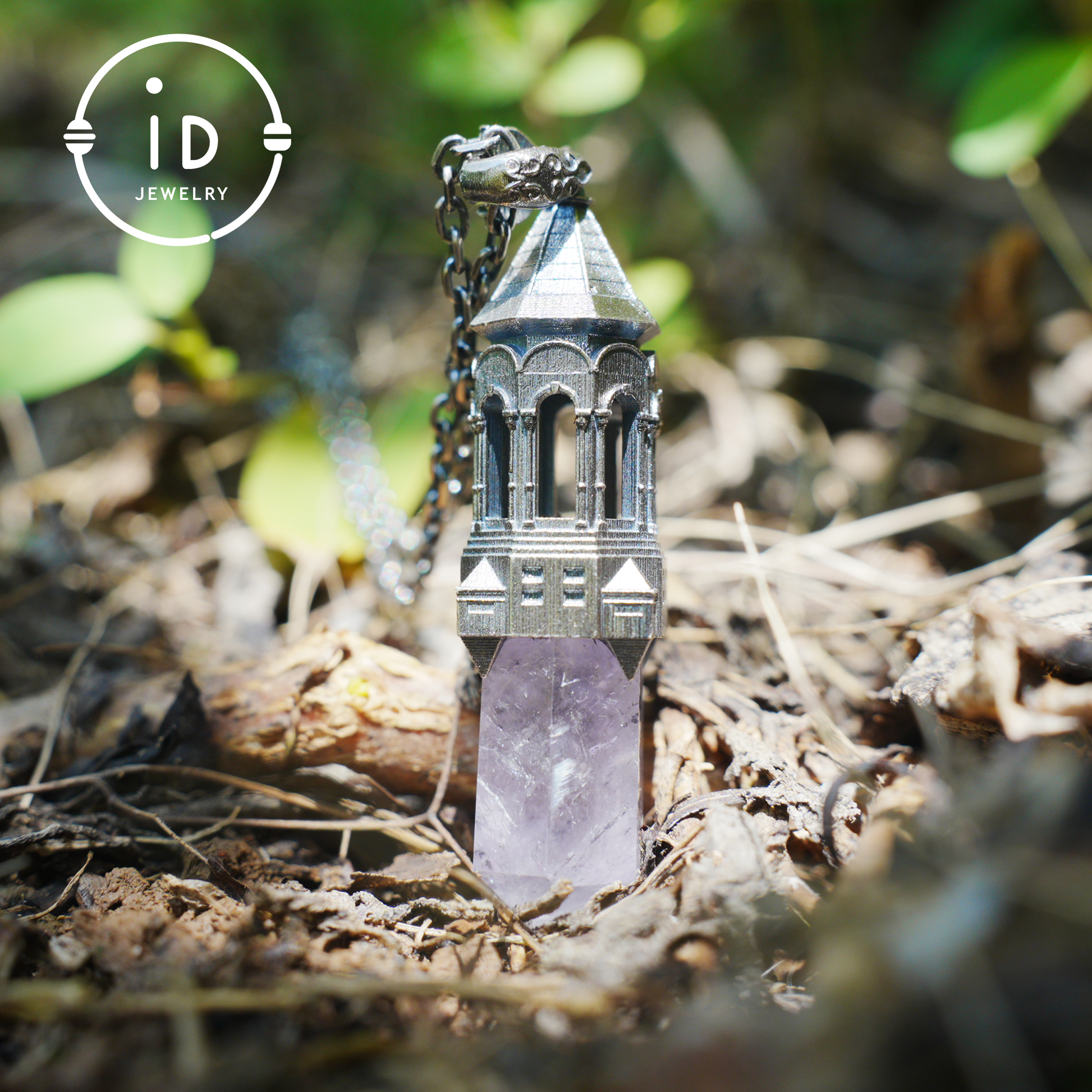 The tower symbolizes order and time awareness, while the faceted amethyst represents purification, spiritual focus, and deep intuition. It connects earth and spirit.