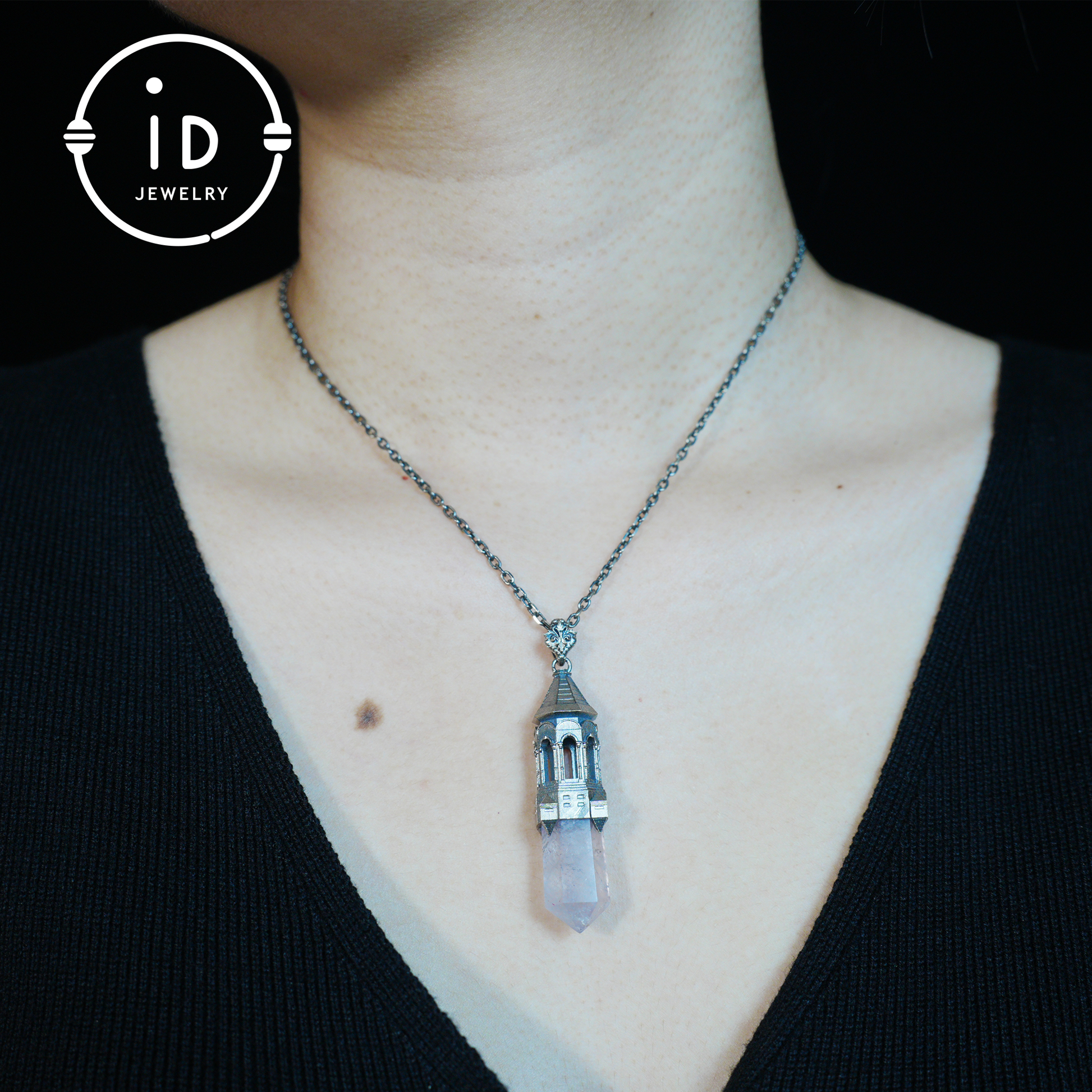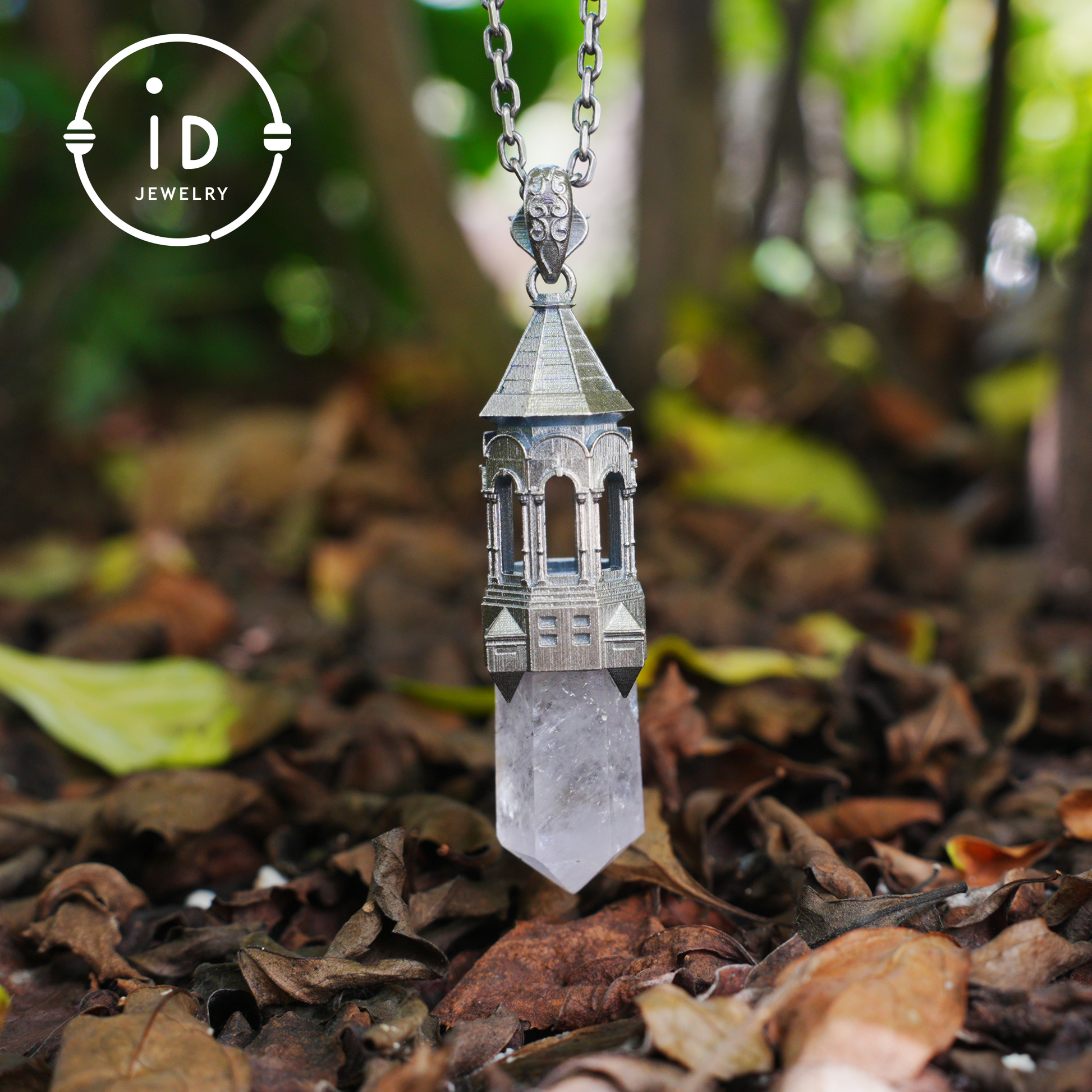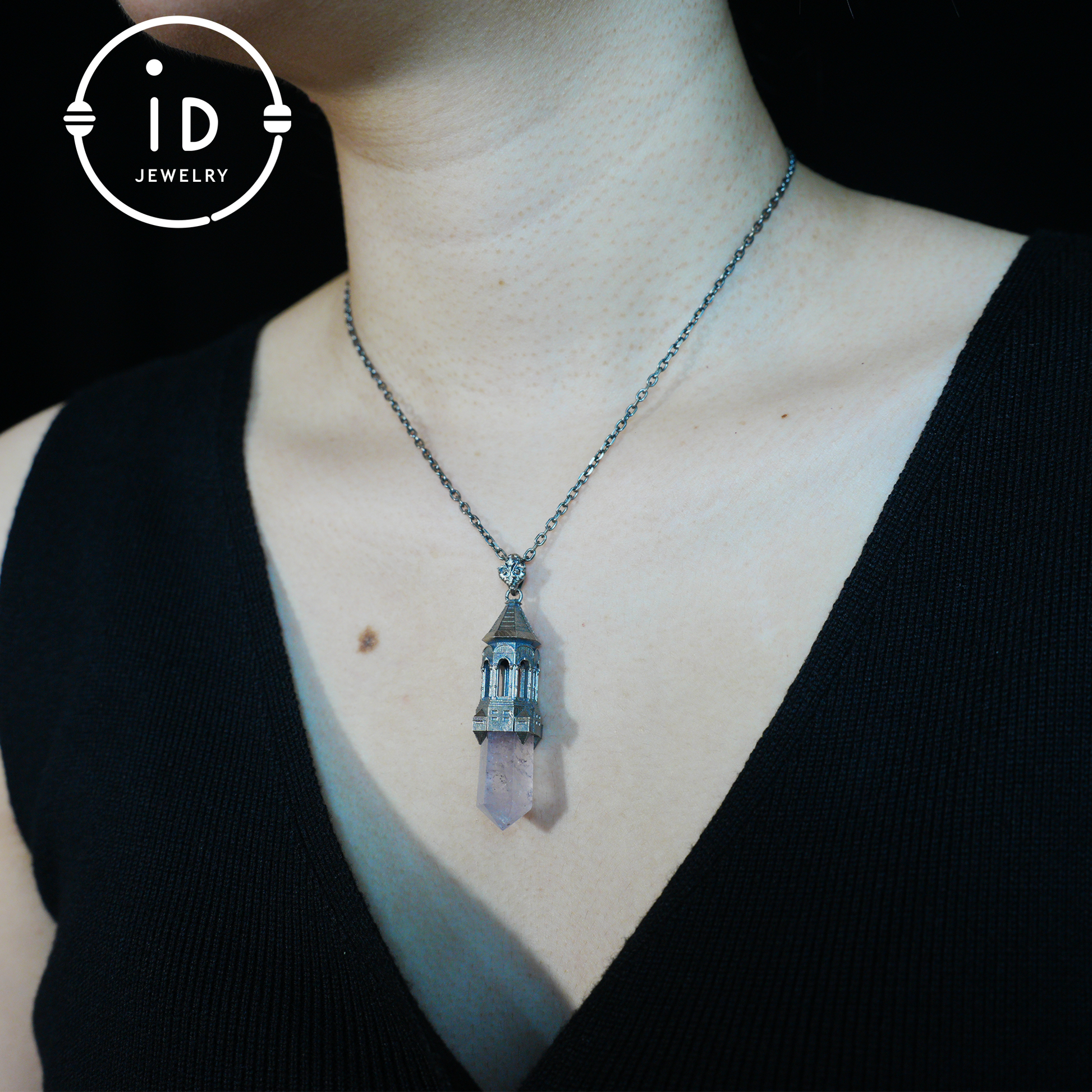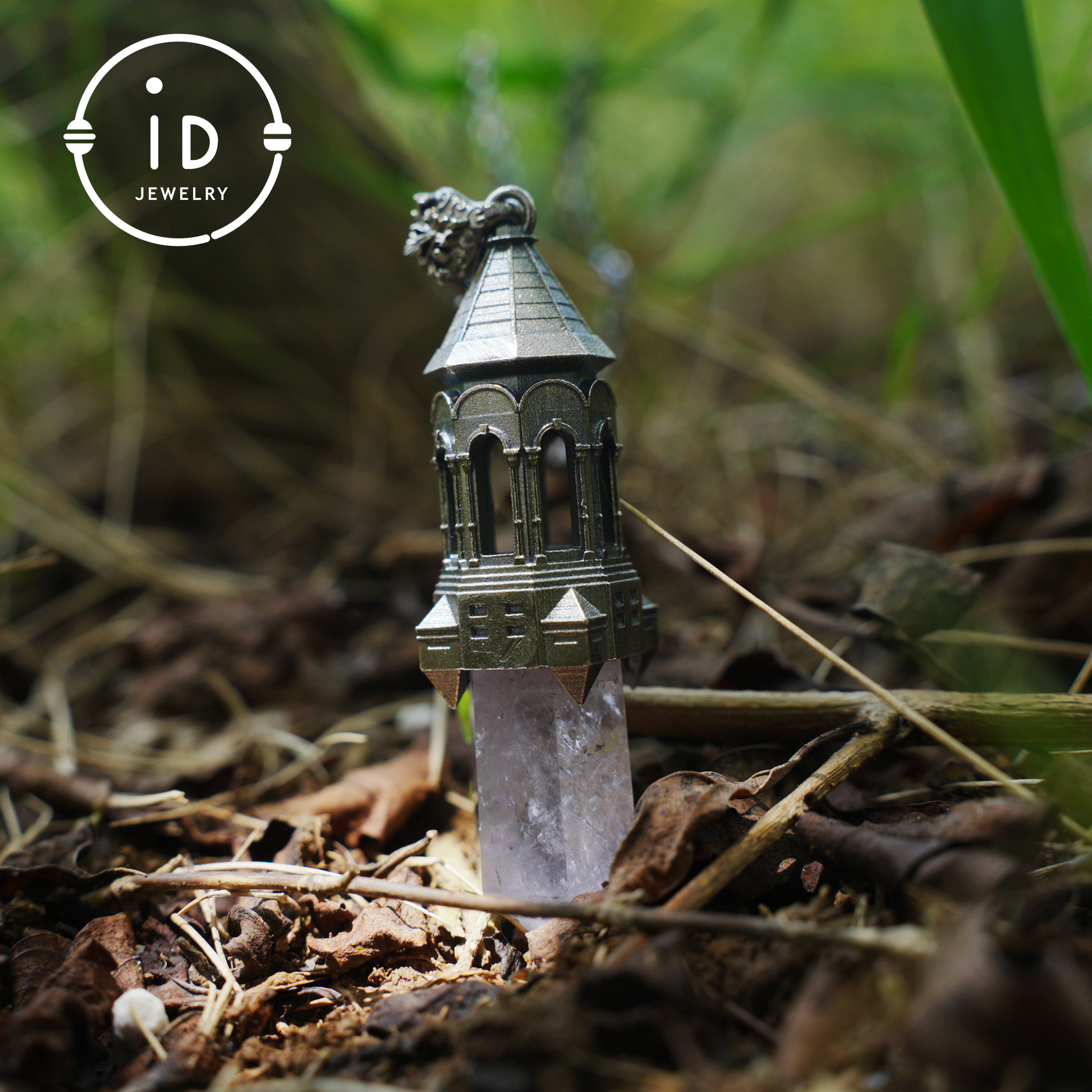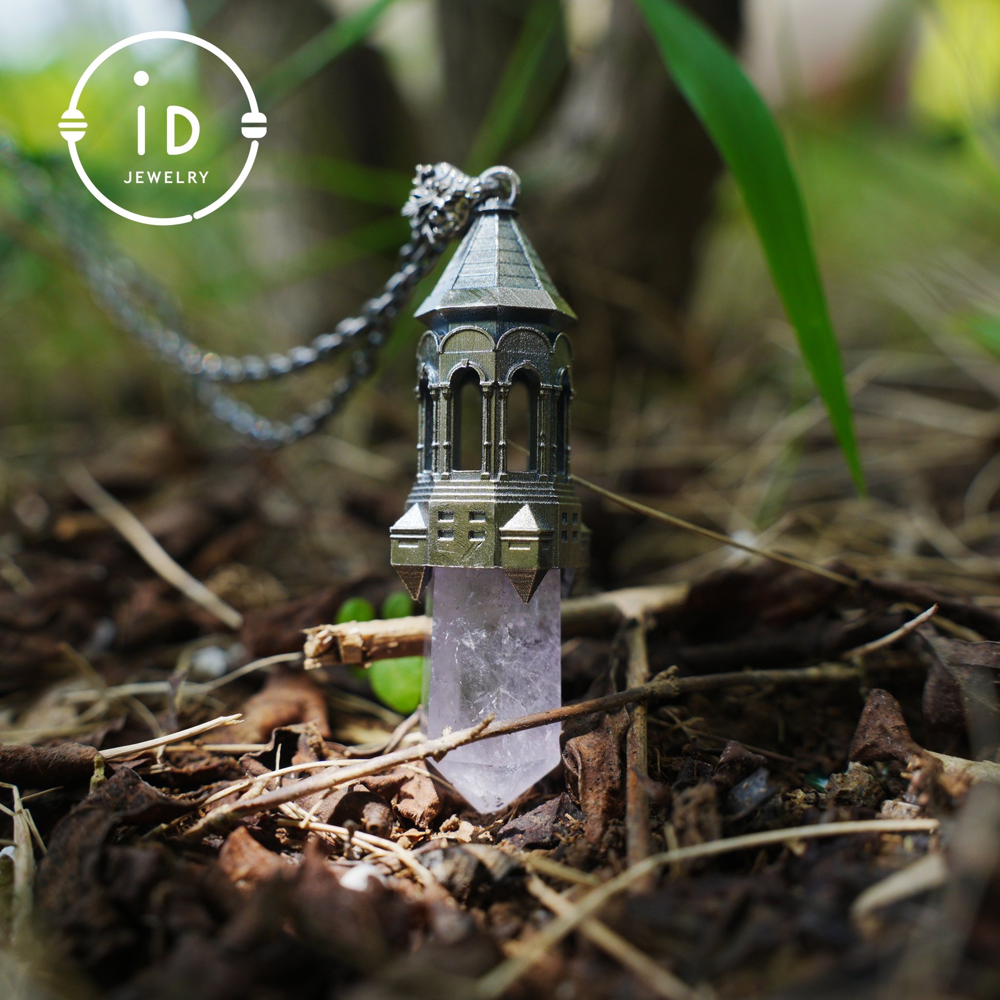 The tower symbolizes order and time awareness, while the faceted amethyst represents purification, spiritual focus, and deep intuition. It connects earth and spirit.