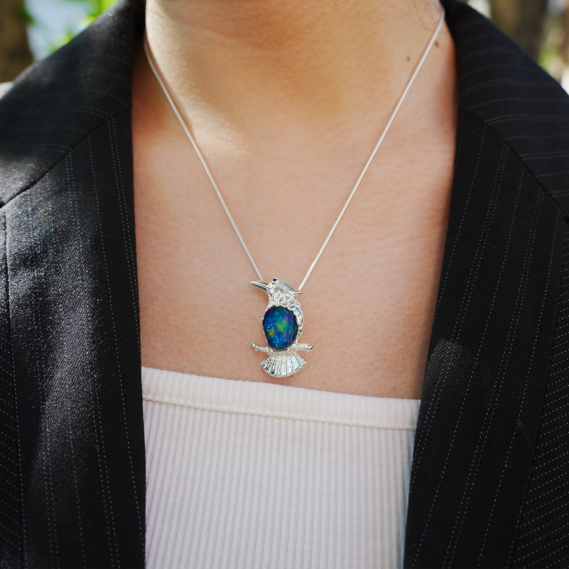 This piece depicts a silver bird resting on a branch, its body shimmering with cosmic blue hues. The deep enamel reflects both tranquility and emotion — a symbol of silent wishes and spiritual grace.