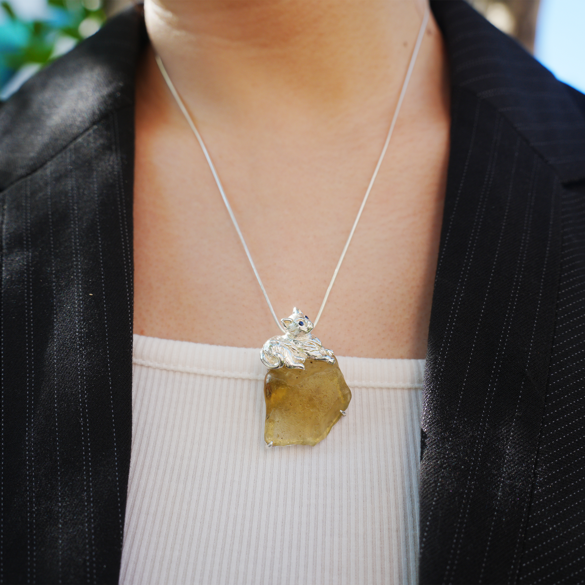 This artistic piece features a silver cat carved from 925 sterling silver, peacefully resting atop a raw natural glass gemstone — an enchanting blend of elegance and serenity.