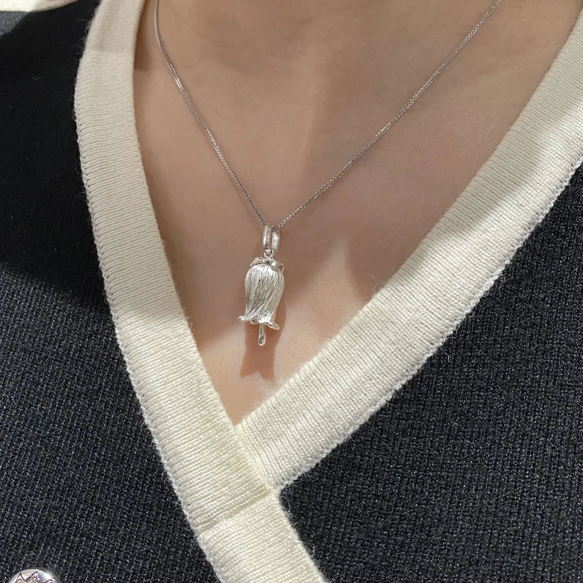 Each piece — whether the dangling earrings or pendant necklace — is handcrafted in 925 sterling silver, inspired by the French tradition of giving lilies of the valley on May 1st as tokens of love and good fortune.