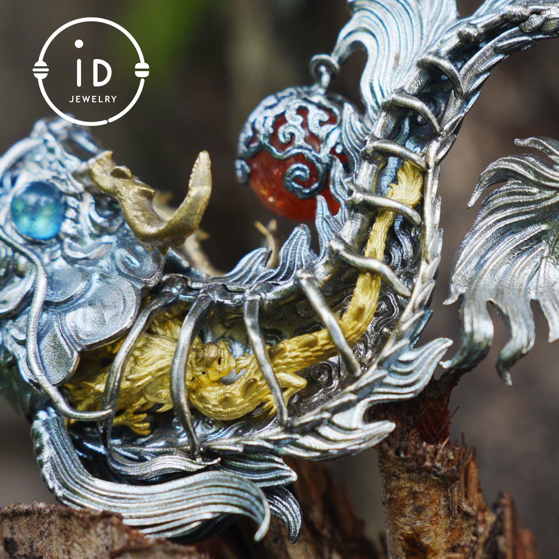 The silver body design symbolizes protection, the golden backbone renewal, the eye of labradorite intuition, while the sunstone represents the inner flame of hope.