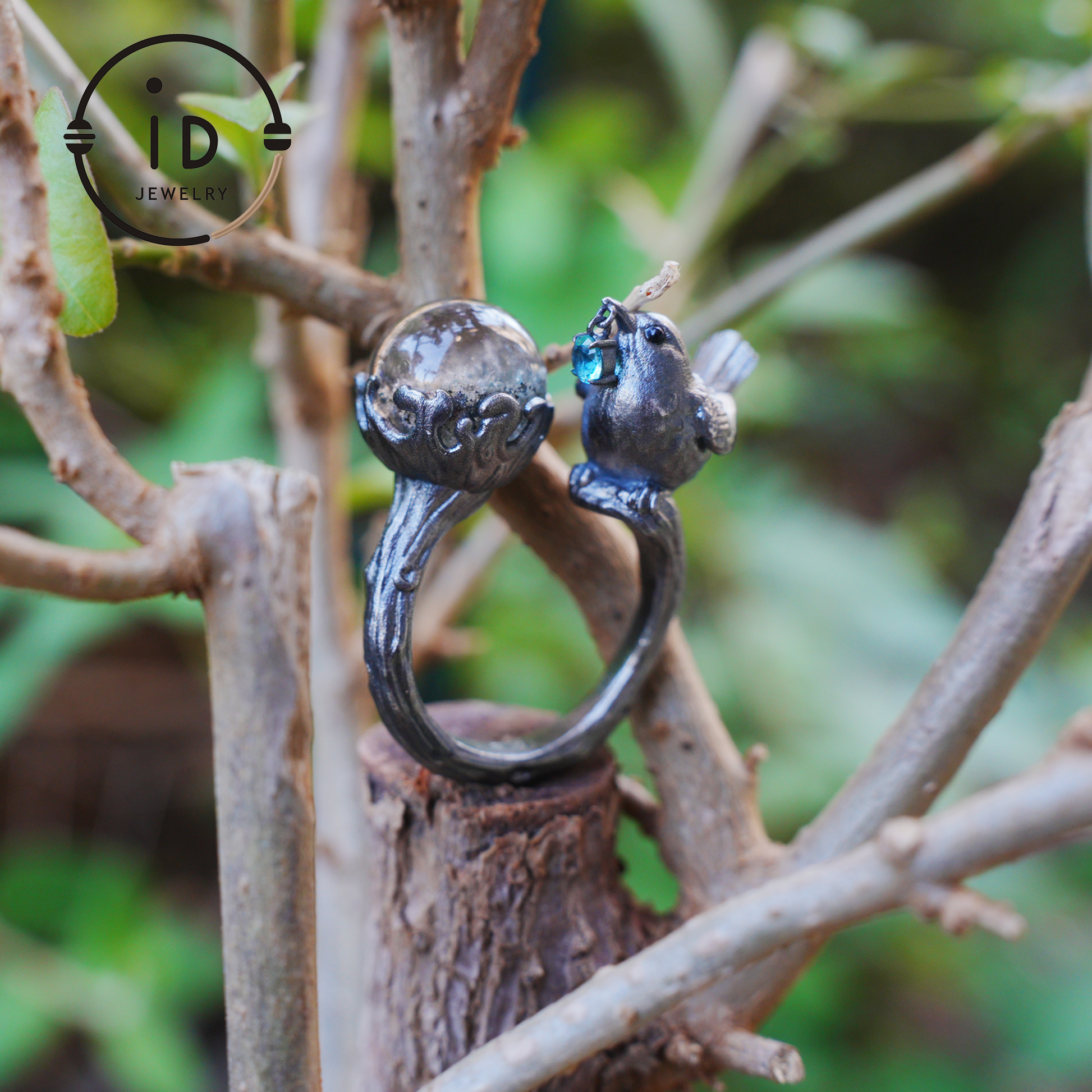 Adjustable 925 Silver Bird Ring with Crystal Sphere and Green Bead in Fairy Nature Style, Meaningful Gift for Nature Lovers
