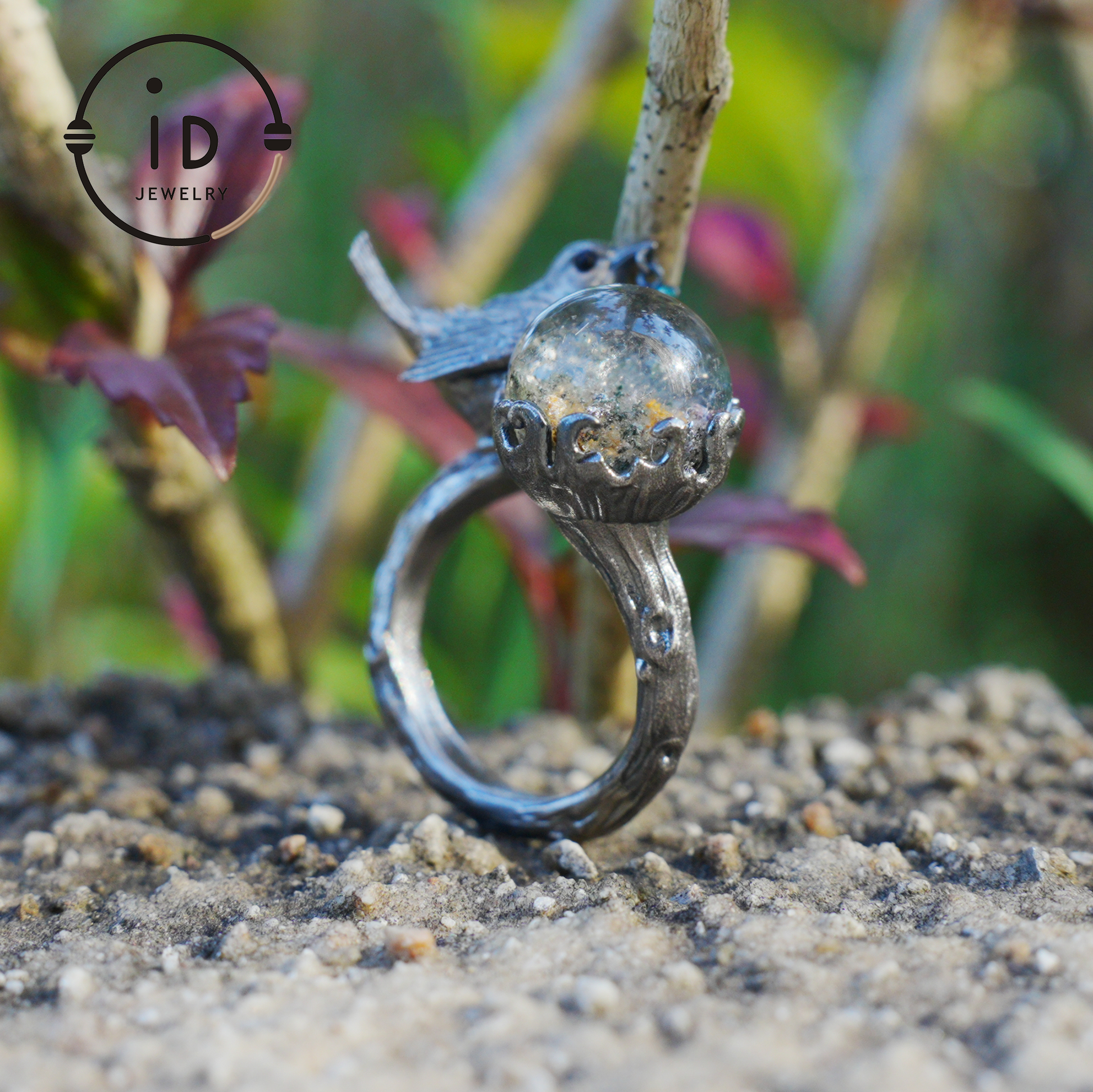In a world where true silence has become rare, this bird ring with a crystal sphere carries a message of inner calm. Crafted from oxidized 925 silver, it features a hand-polished lodolite orb and a small green accent stone – a reminder that clarity emerges from deep within. This piece blends symbolism, the power of nature, and gentle motion into a wearable talisman for healing and awareness. A meaningful gift for women who cherish natural beauty and quiet significance.