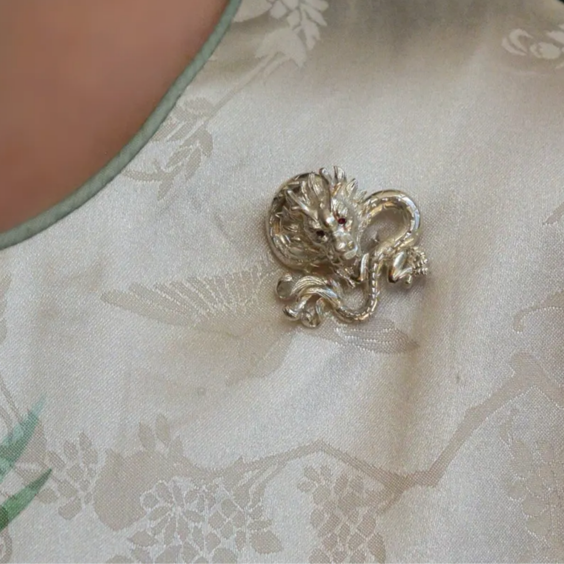This Dragon Brooch Pendant is meticulously handcrafted in 925 sterling silver, featuring a majestic dragon with ruby-set eyes symbolizing courage, power, and protection.