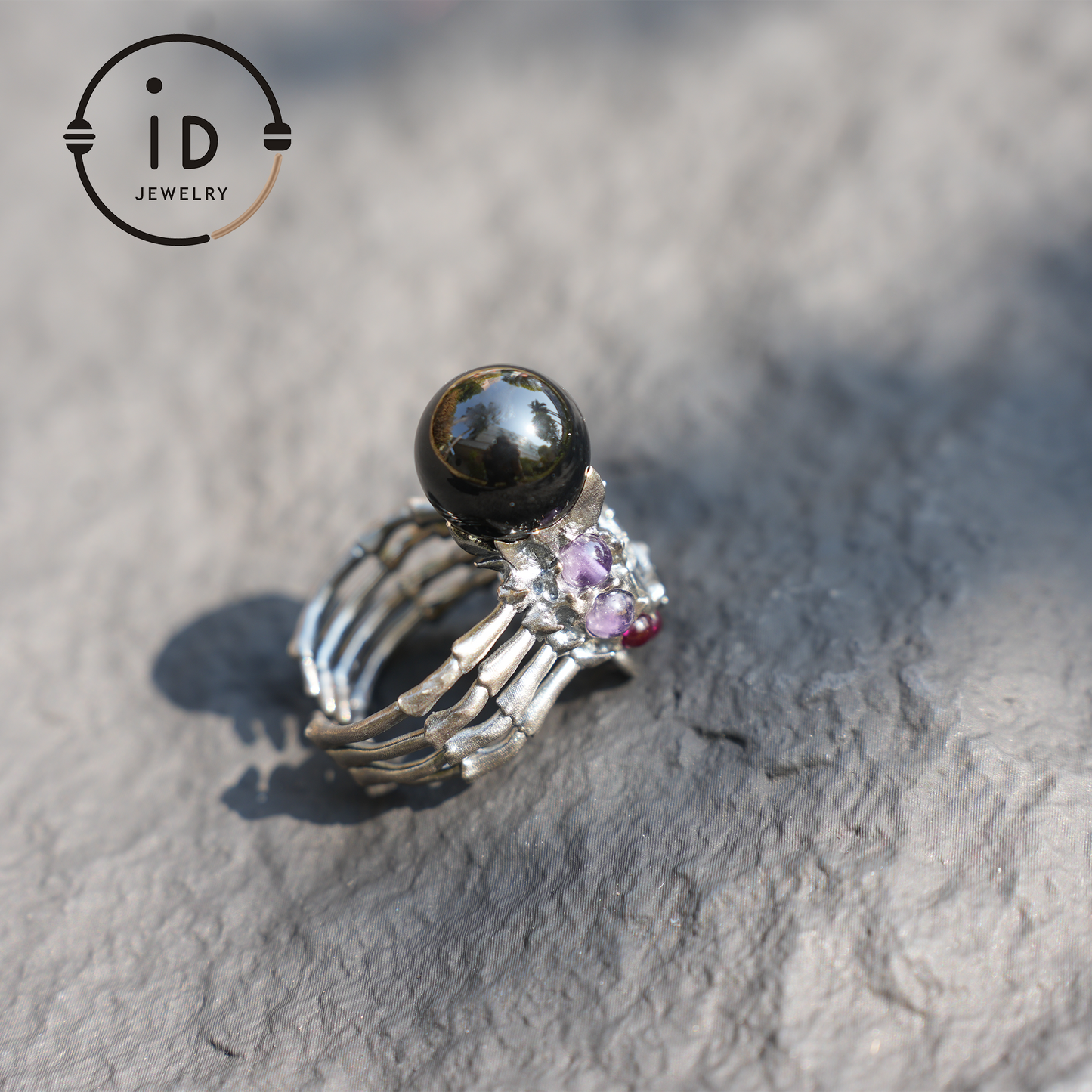 Handgefertigt aus hochwertigem 925er Silber , mit einem kunstvoll gefassten Achat-Edelstein . Die detaillierte Metallverarbeitung verleiht ihm einen dunklen, eleganten Charme und macht ihn zu einem perfekten Talisman oder Schutzring .