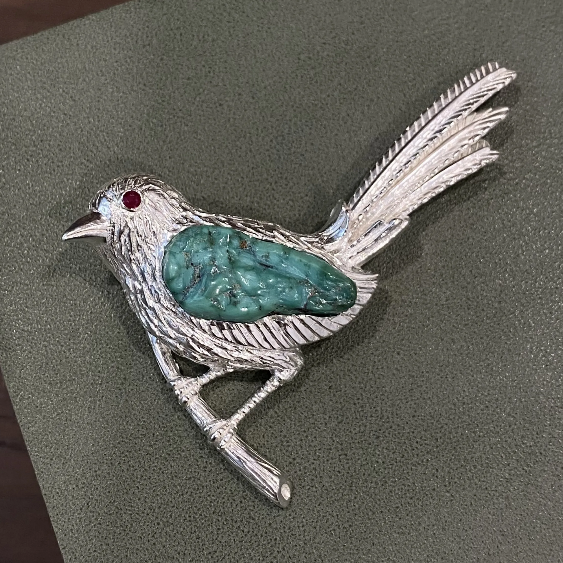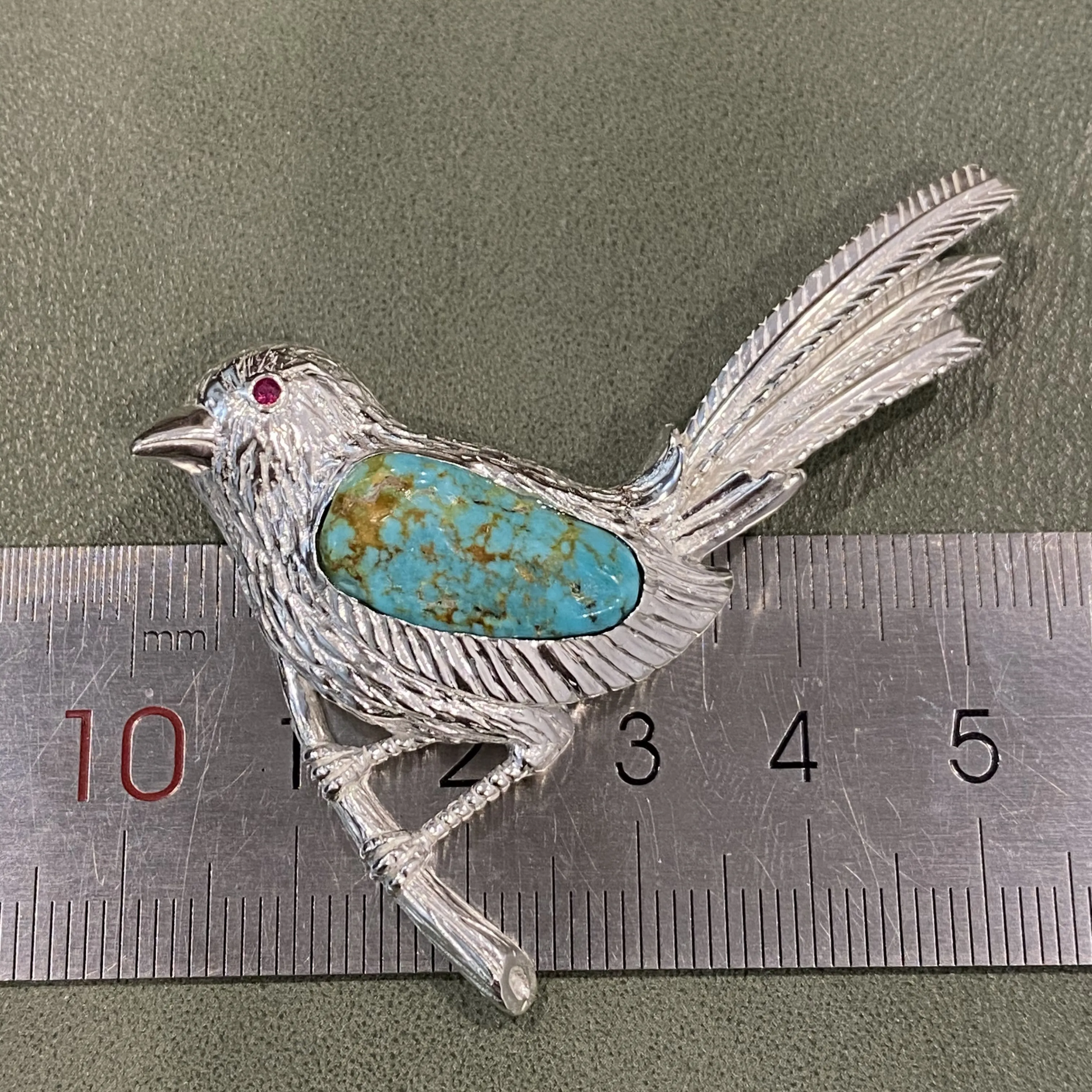 This Magpie Brooch Pendant is meticulously handcrafted in 925 sterling silver, featuring a natural turquoise body and gemstone-set eyes.