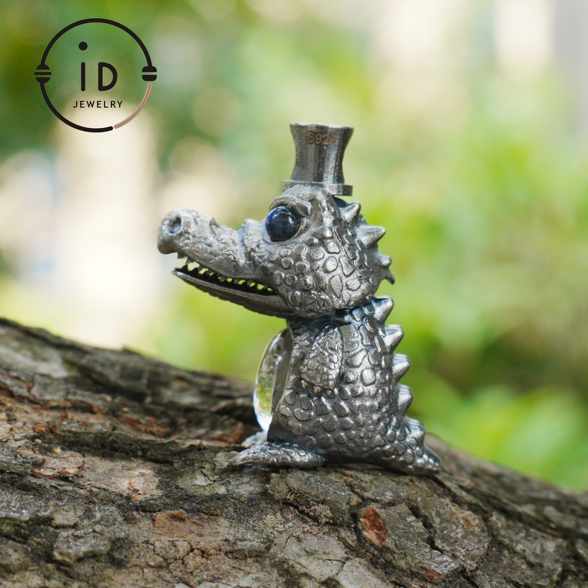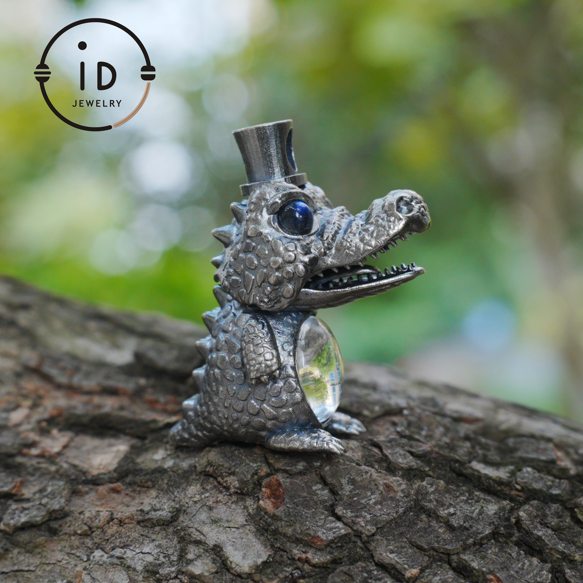 This handcrafted silver totem pendant combines narrative imagery with material depth. Made from oxidized 925 sterling silver, the sculpture depicts a seated crocodile with a textured body and luminous eyes. Inside the transparent crystal belly, a small baby crocodile rests quietly. Worn as a pendant, this piece feels like a silent talisman, expressing inner focus, conscious presence, and calm strength.