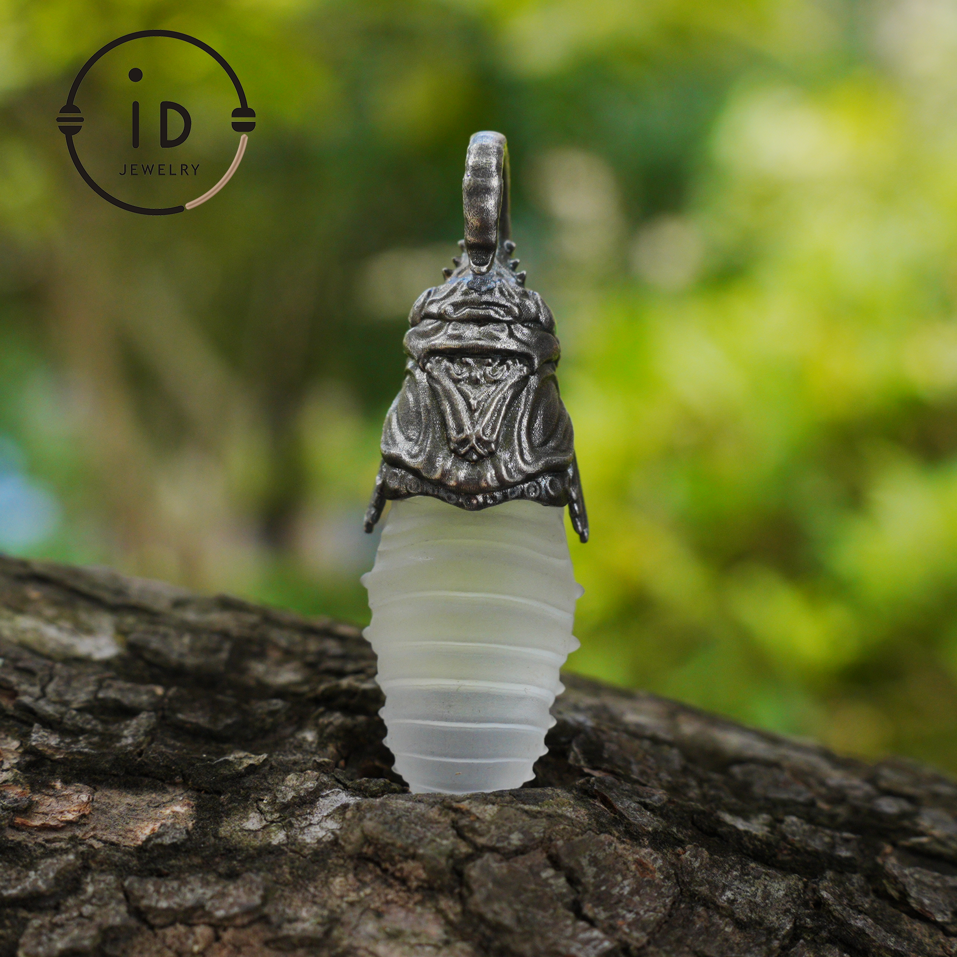 In this mystical pendant, symbolic power, transformation and craftsmanship come together. The oxidized head of a symbolic figure rests atop a hand-carved rock crystal body. Its organic form and frosted texture convey the idea of transition, inner change and balance. The green chalcedony stones on each side radiate calm. This piece is not only a striking accessory, but also a symbolic companion for those on a personal journey.