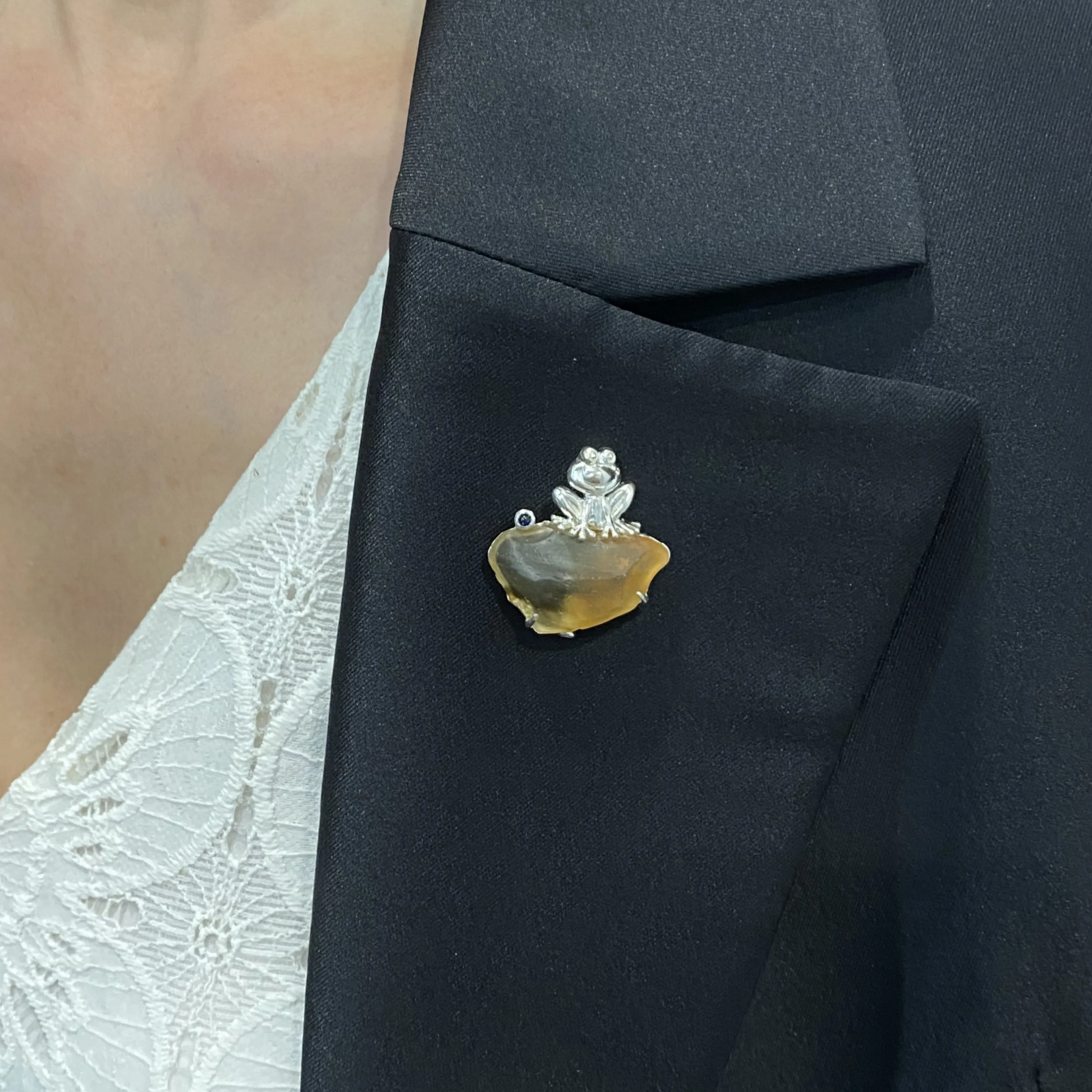 This Frog Brooch Pendant is handcrafted in 925 sterling silver, featuring a joyful frog perched atop a natural glass stone with a tiny sapphire eye accent.