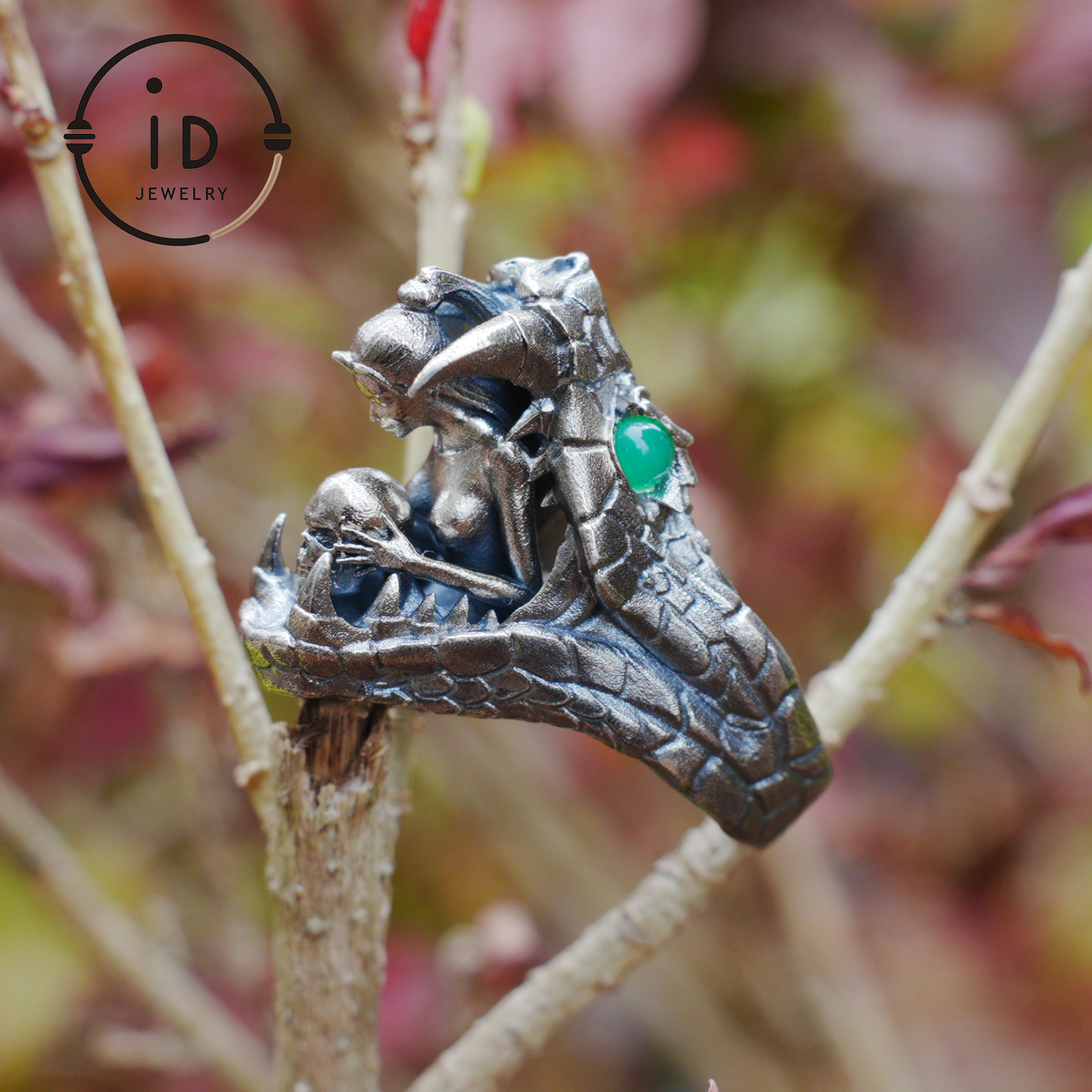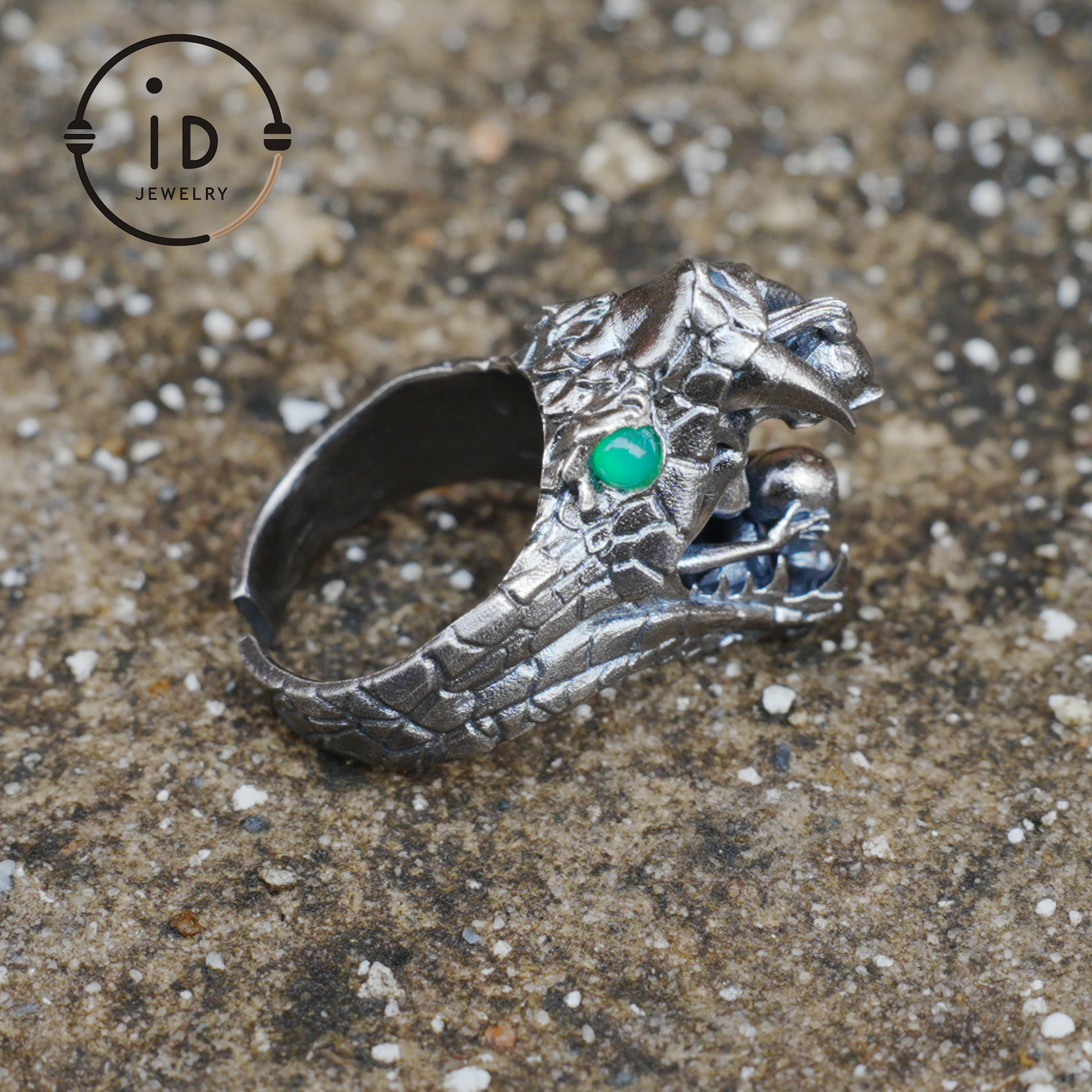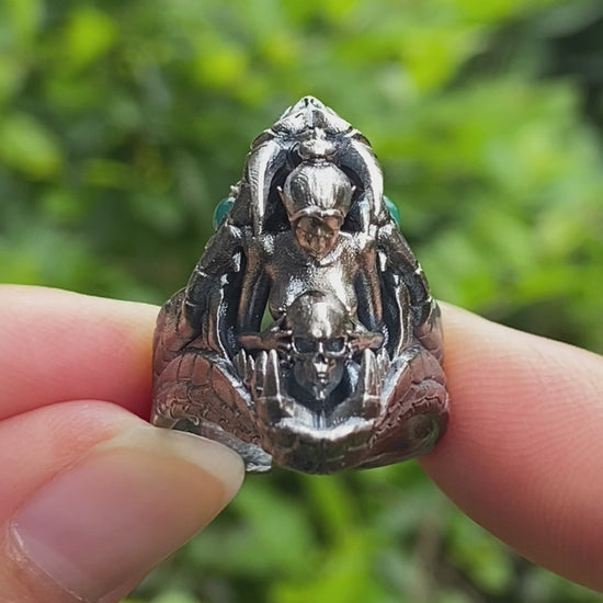 In the silence of symbolic struggle, this gothic-style snake ring reveals layers of strength, restraint, and transformation. Crafted from oxidized 925 sterling silver, the open mouth encloses sculptural human forms holding a skull — a metaphor of duality and awakening. The green gemstone eye adds depth and mysticism. Whether as a talisman, a bold statement ring, or a gift for those who embrace inner evolution, this piece speaks to the power found in stillness.