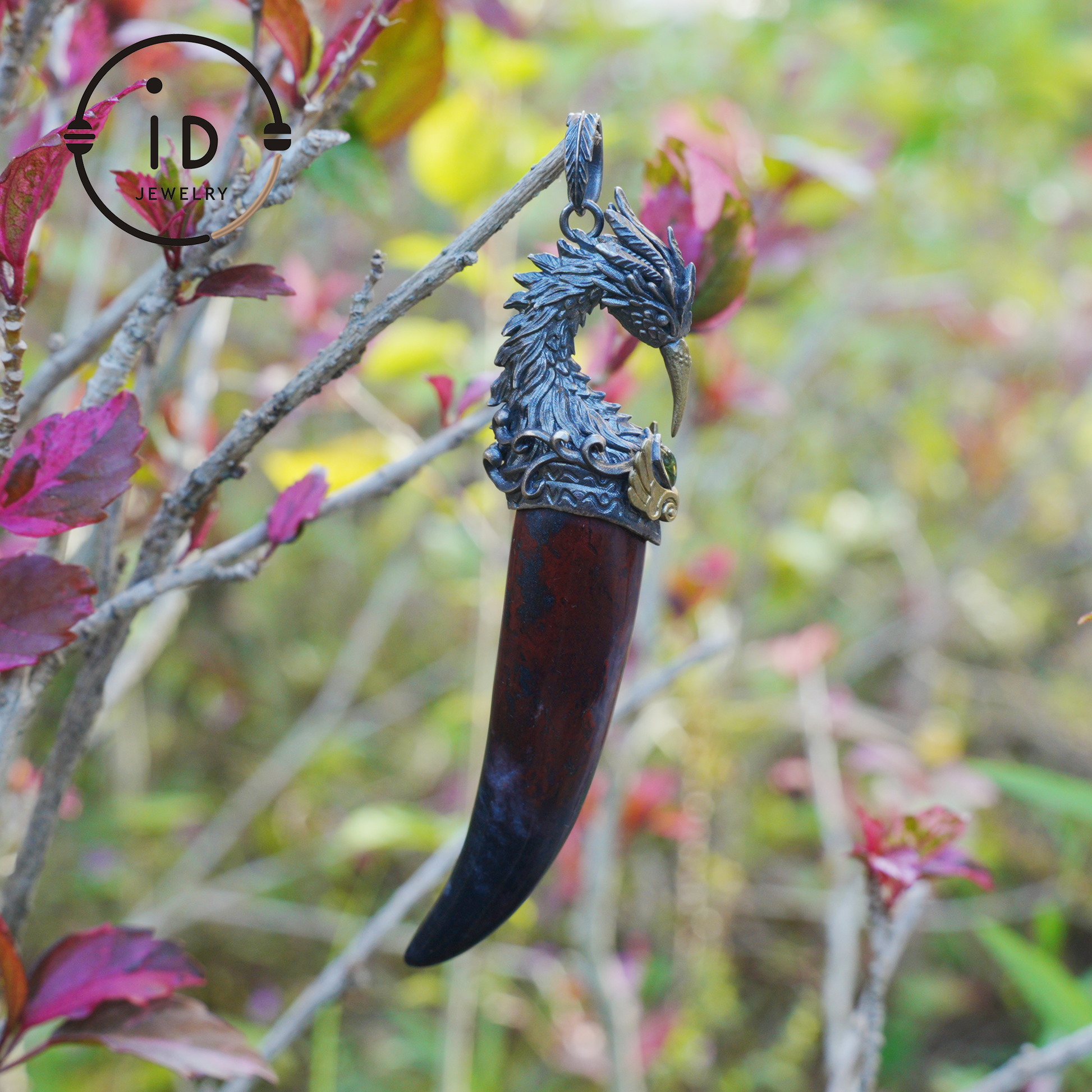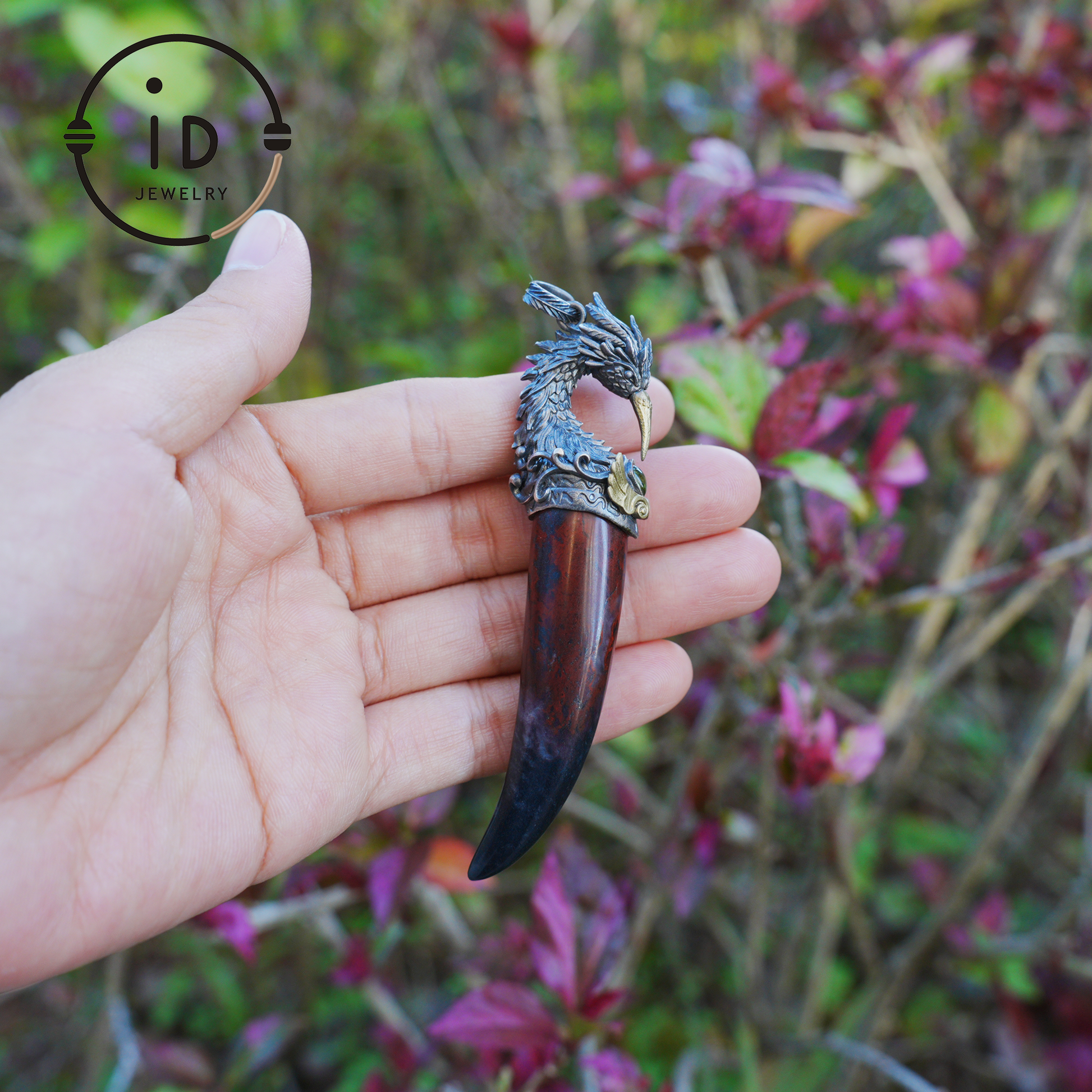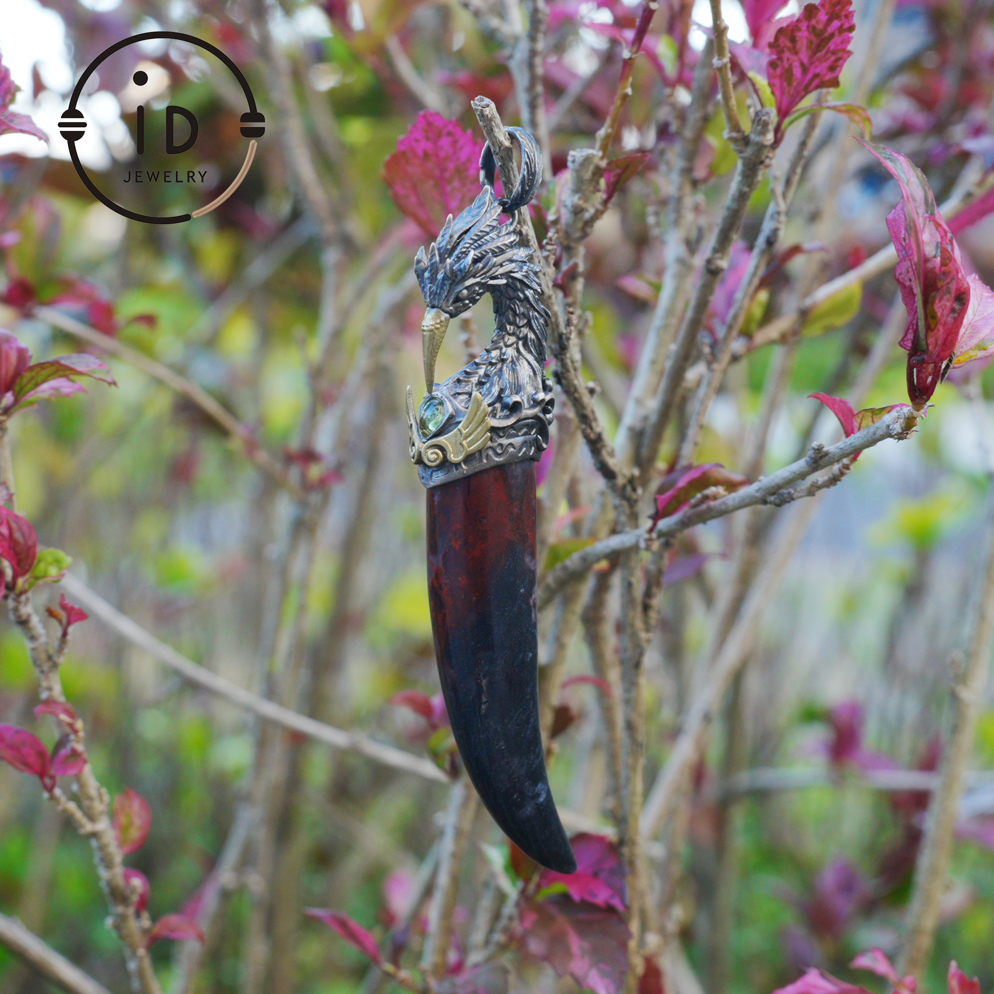 Blood Jasper Pendant with Carved Phoenix Head in 925 Sterling Silver & Bronze, Totem Talisman Necklace, Gothic Mythology Gift for Men Women