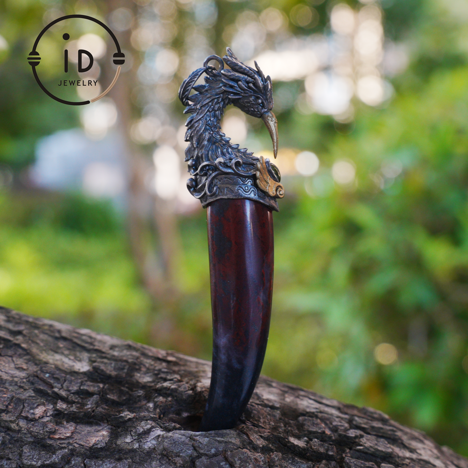 Handcrafted with a patinated surface, detailed phoenix head, ornate patterns, embedded natural stone setting