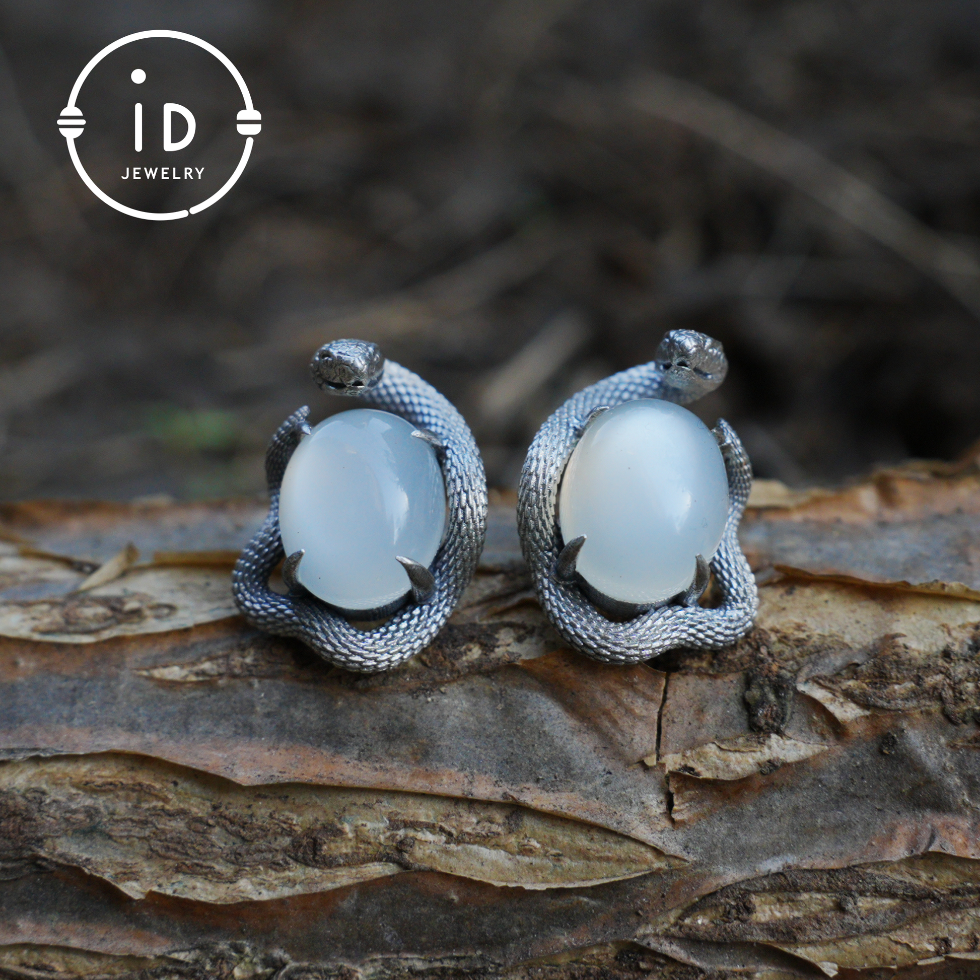 These handcrafted earrings made of oxidized 925 silver combine the quiet aura of moonstone with the symbolic shape of a protectively coiled snake. The blend of delicate silverwork and the softly glowing gemstone lends the design a timeless depth that expresses inner clarity, transformation, and quiet strength. As symbolic jewelry or a personal talisman, these earrings are ideal for women who appreciate subtle meanings and skilled craftsmanship.