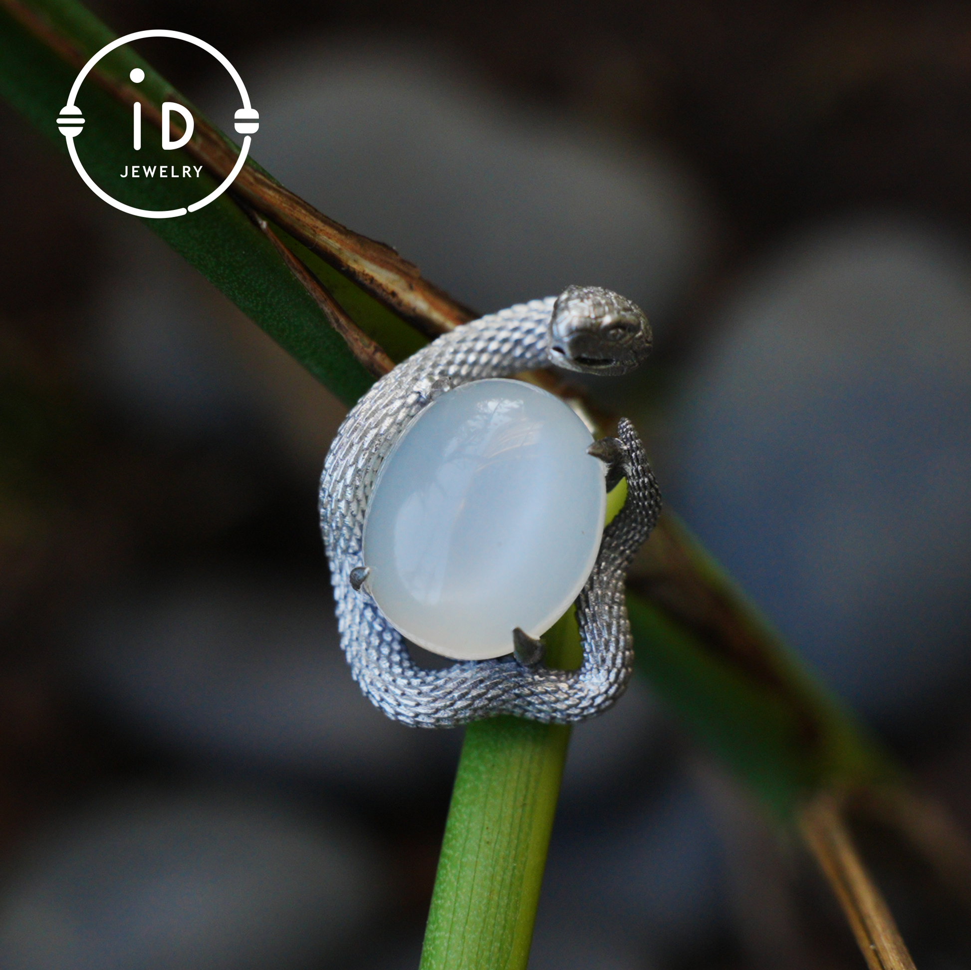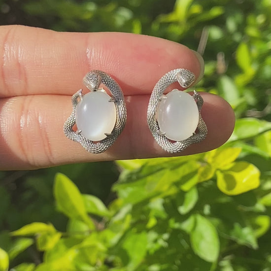 The moonstone represents intuitive clarity and soft inner light; the coiled snake shape symbolizes transformation, protection, and the power of new beginnings.