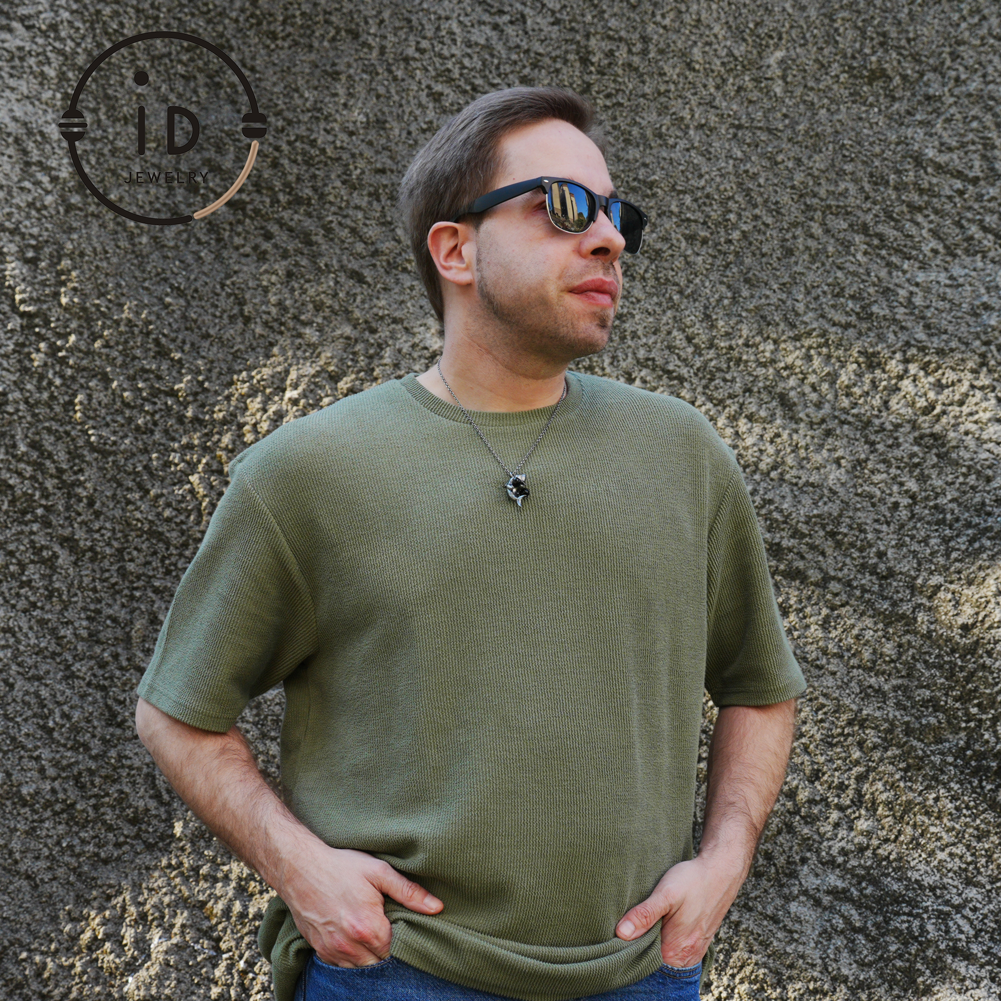 This shark pendant made from oxidized 925 silver combines humor, symbolic power, and intricate craftsmanship into a striking piece of jewelry. The powerful fish holds a polished blue agate – a symbol of emotional clarity and protection. Despite its mighty jaws, the shark smiles – representing inner strength, self-irony, and the art of preserving softness. A unique gift idea for sea lovers, animal enthusiasts, or anyone who wishes to wear something extraordinary in everyday life.