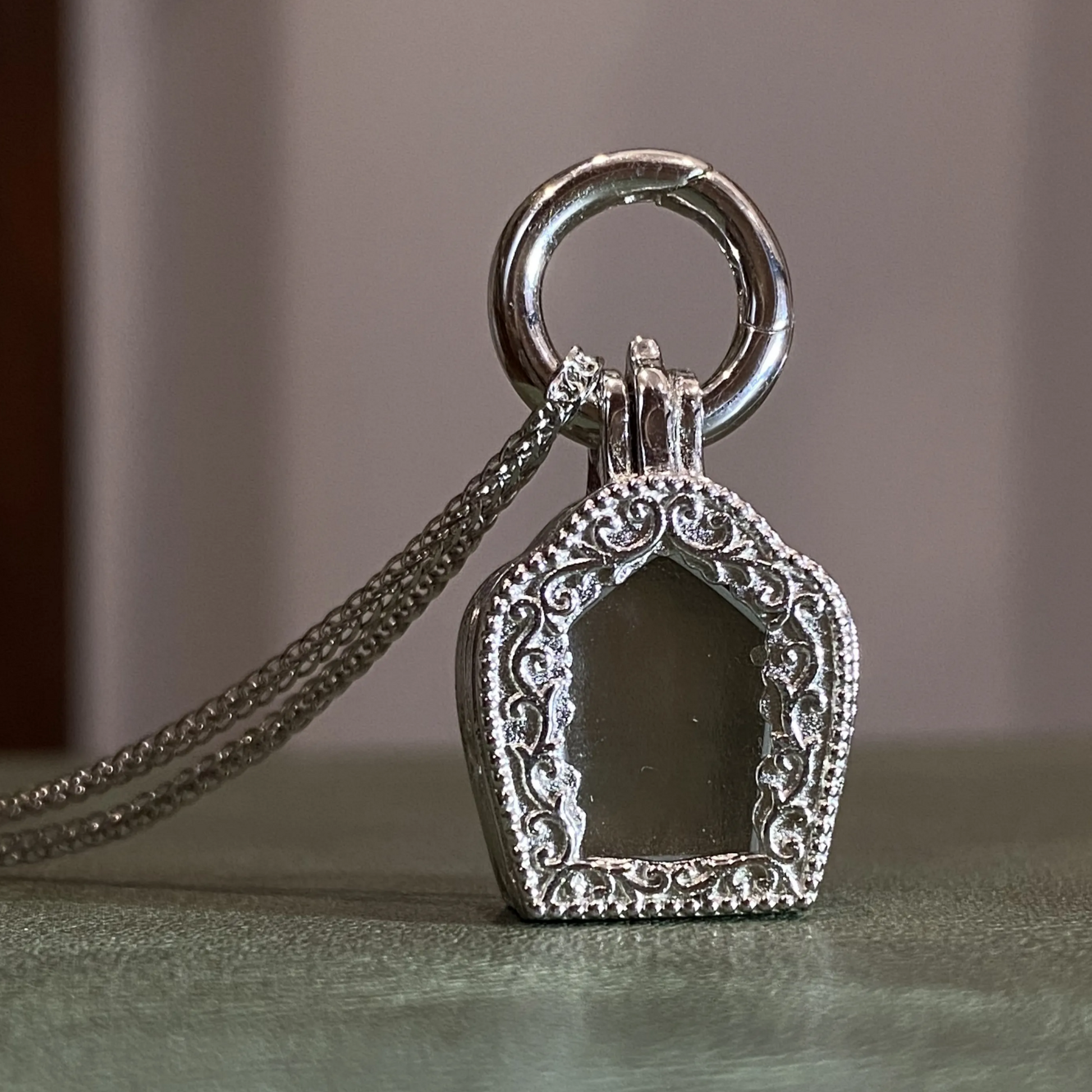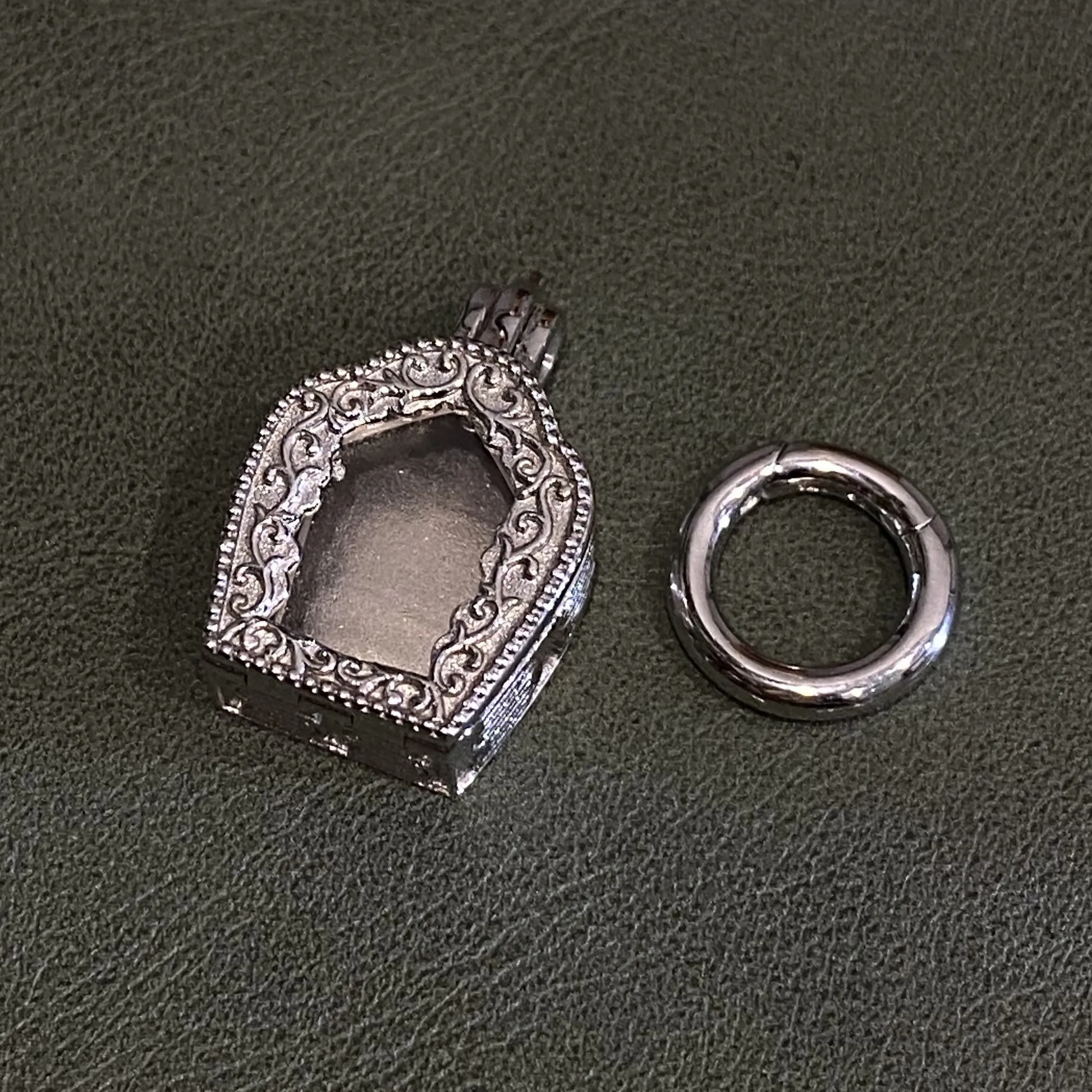This openable amulet pendant is handcrafted from 925 sterling silver, featuring an ornate temple-shaped frame and a transparent acrylic window.