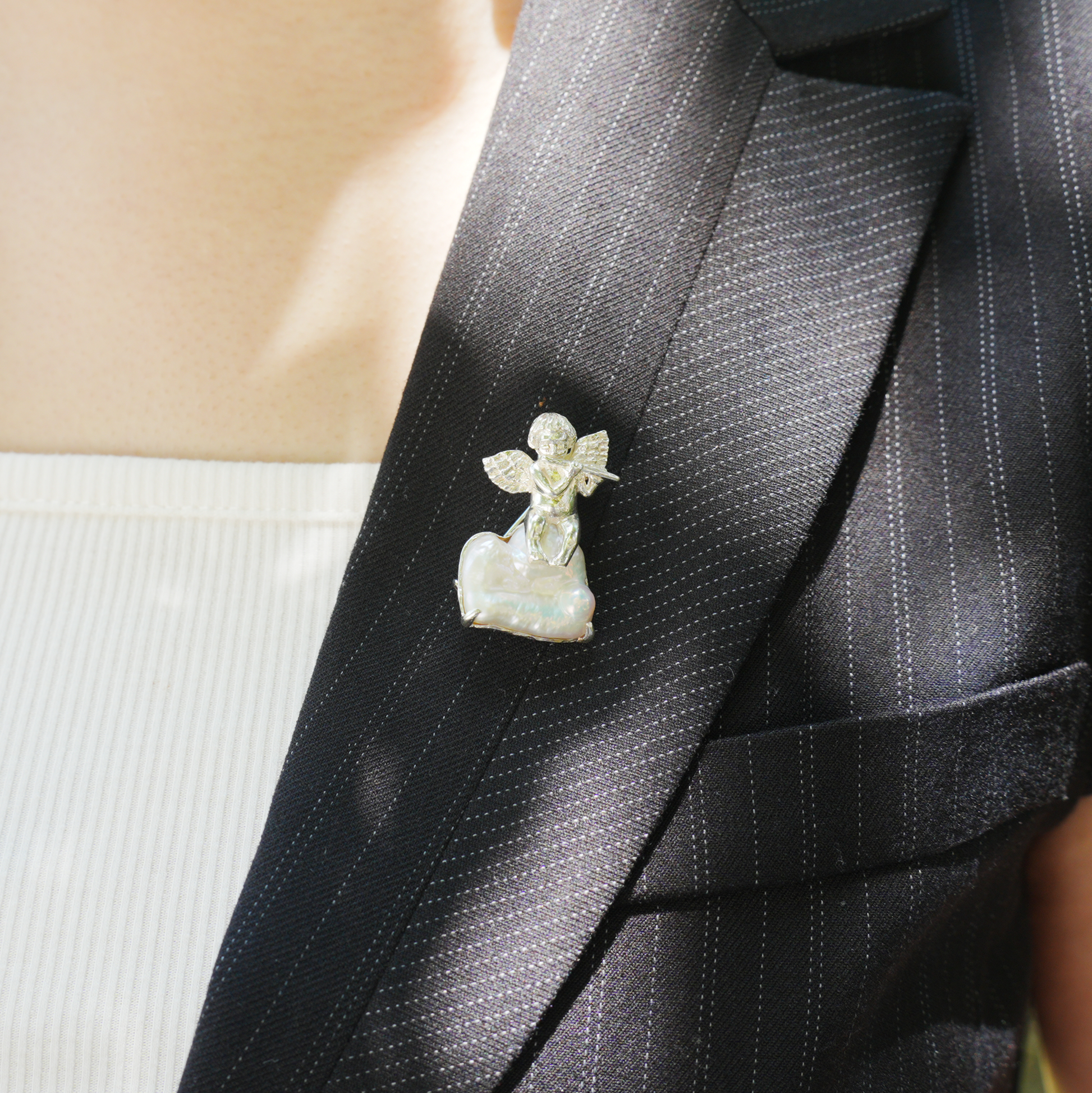 This handcrafted angel pendant brooch captures a serene moment — an angel playing the flute upon a natural baroque pearl cloud.