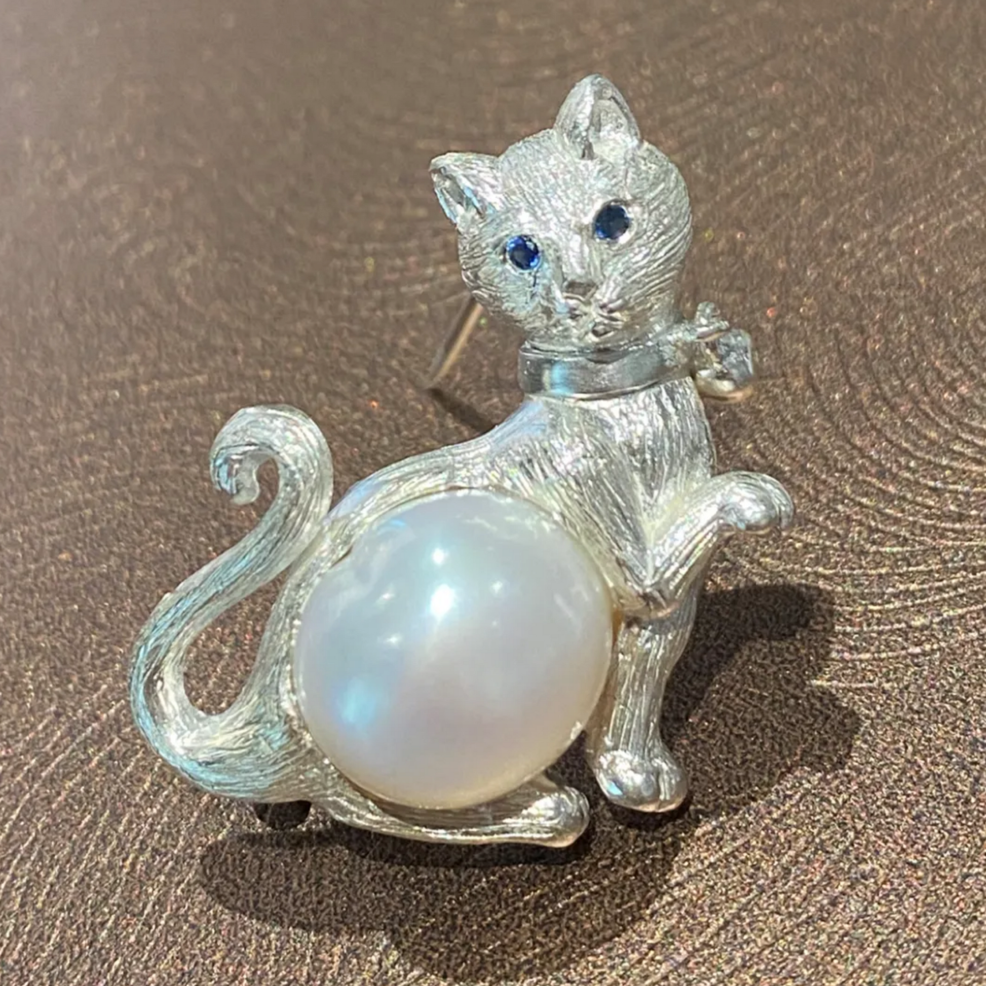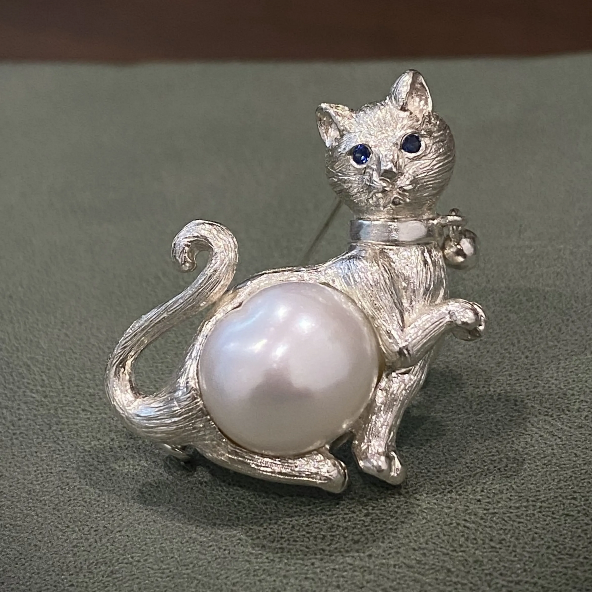 Lustrous pearl forms the cat’s body, symbolizing purity and emotional serenity