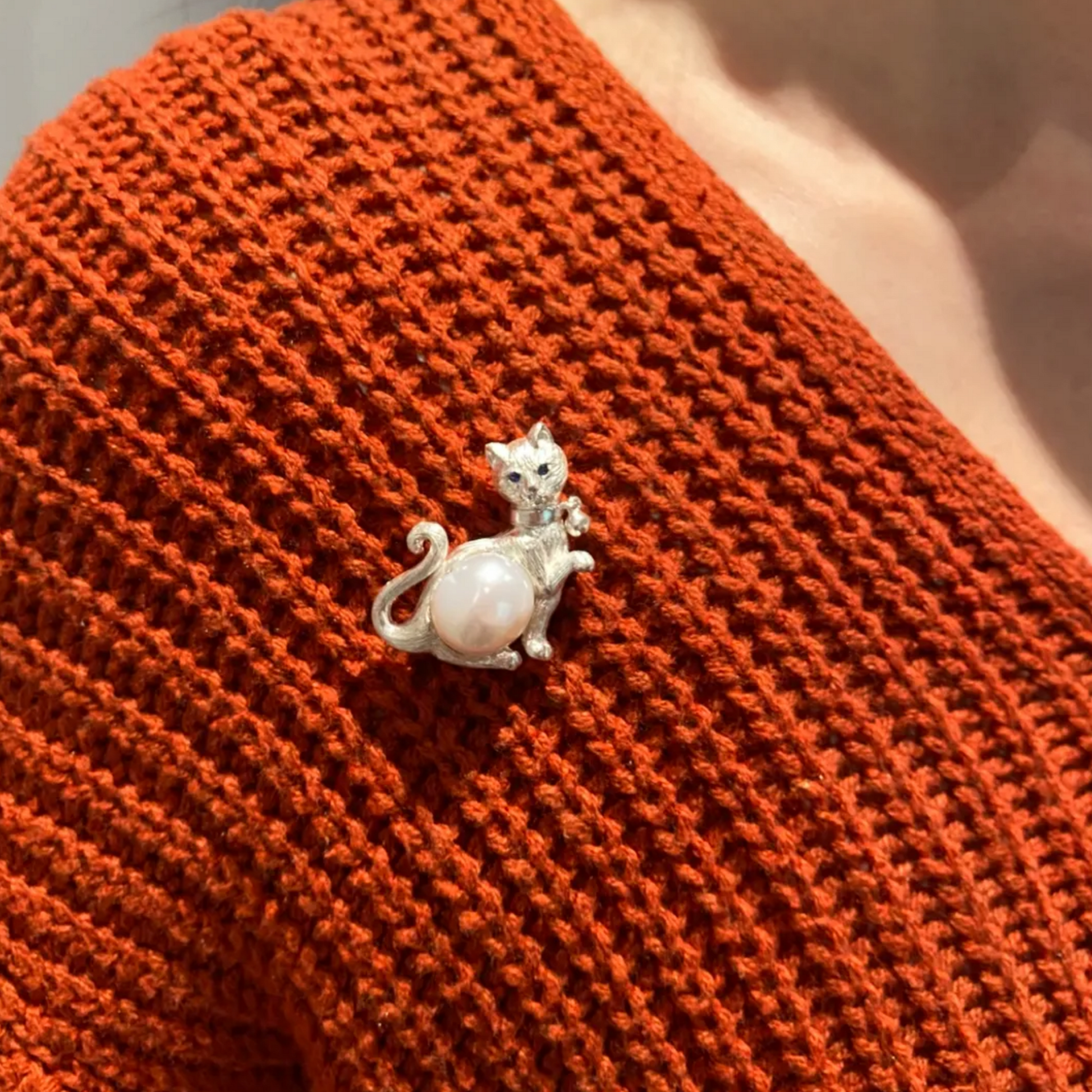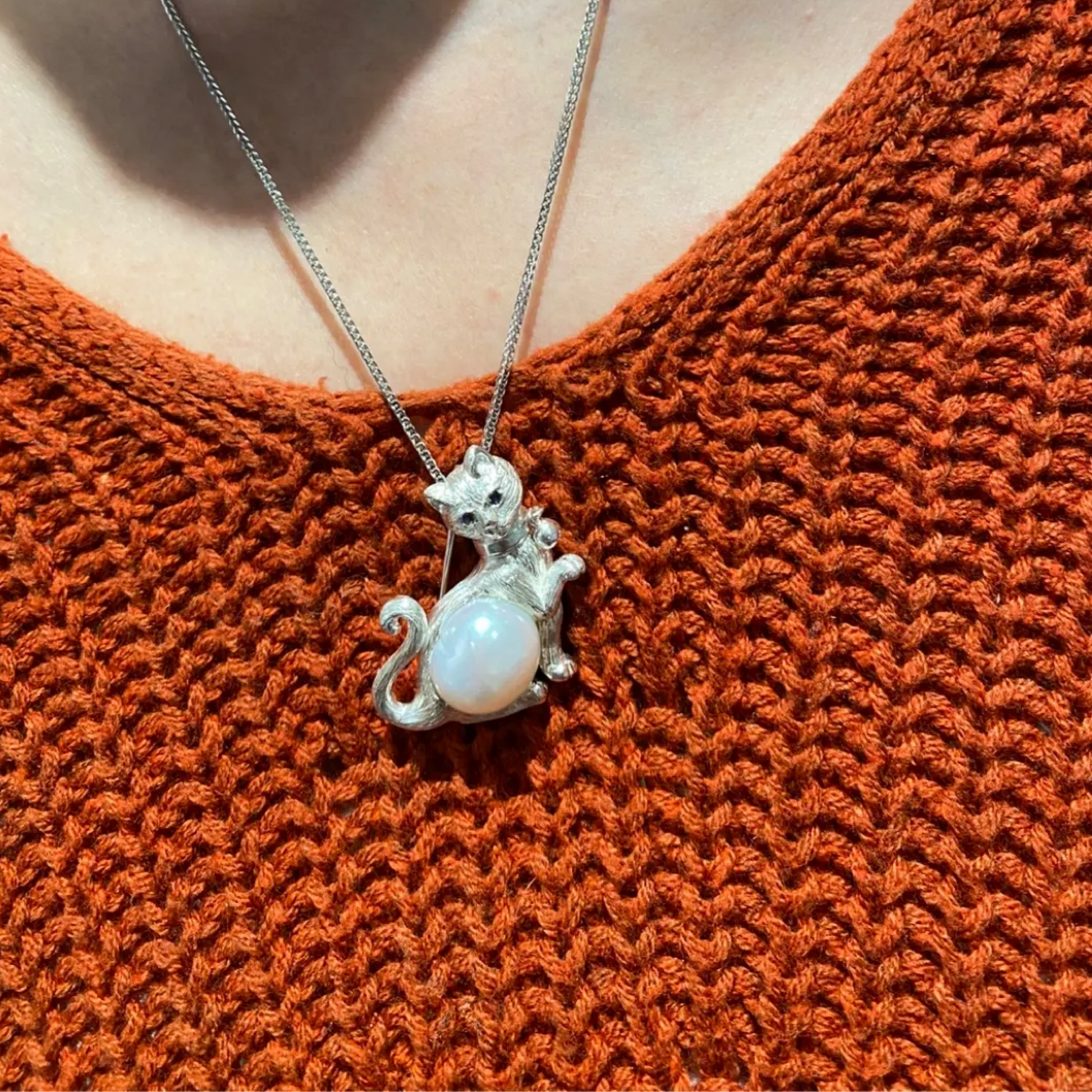 925 Silver Cat Pearl Brooch Pendant | Handmade Animal Jewelry | Sapphire Eyes Kitty Pin | Gift for Cat Lovers or Her