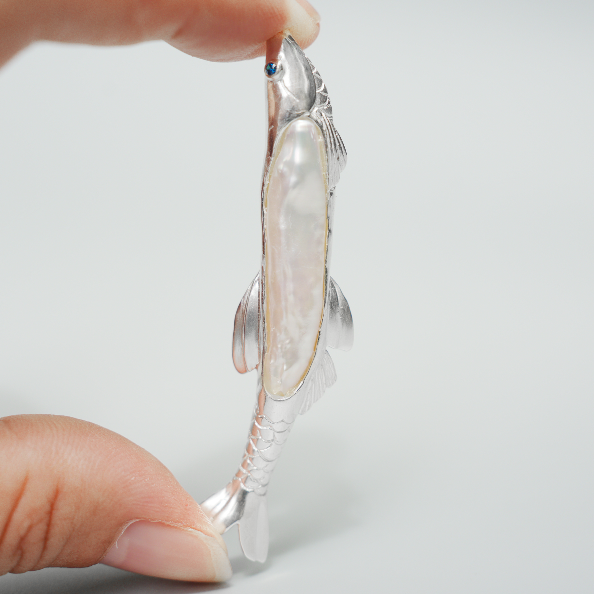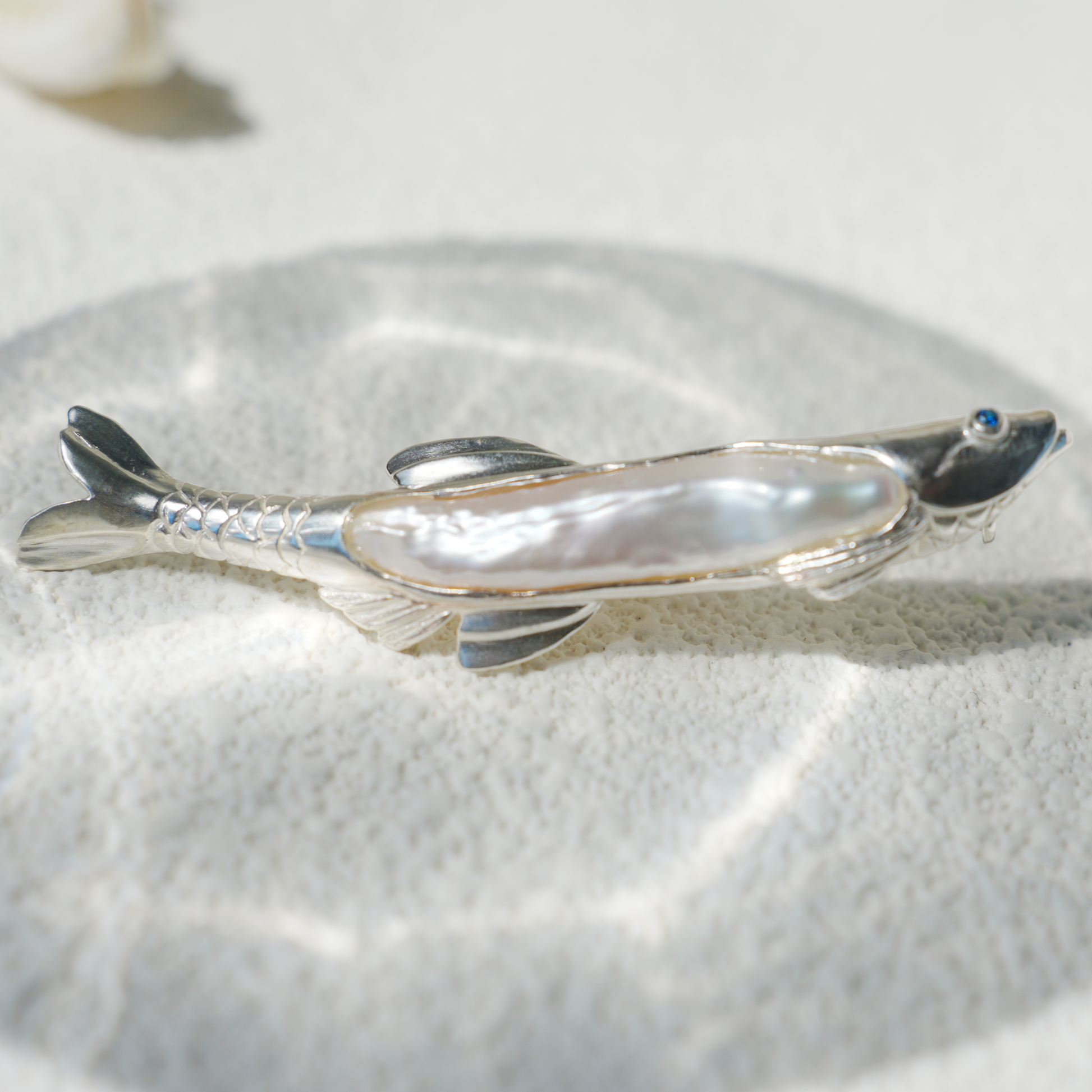 Crafted in 925 sterling silver, it features a natural freshwater pearl forming the luminous body of the fish and a blue sapphire eye that shines with inner wisdom.