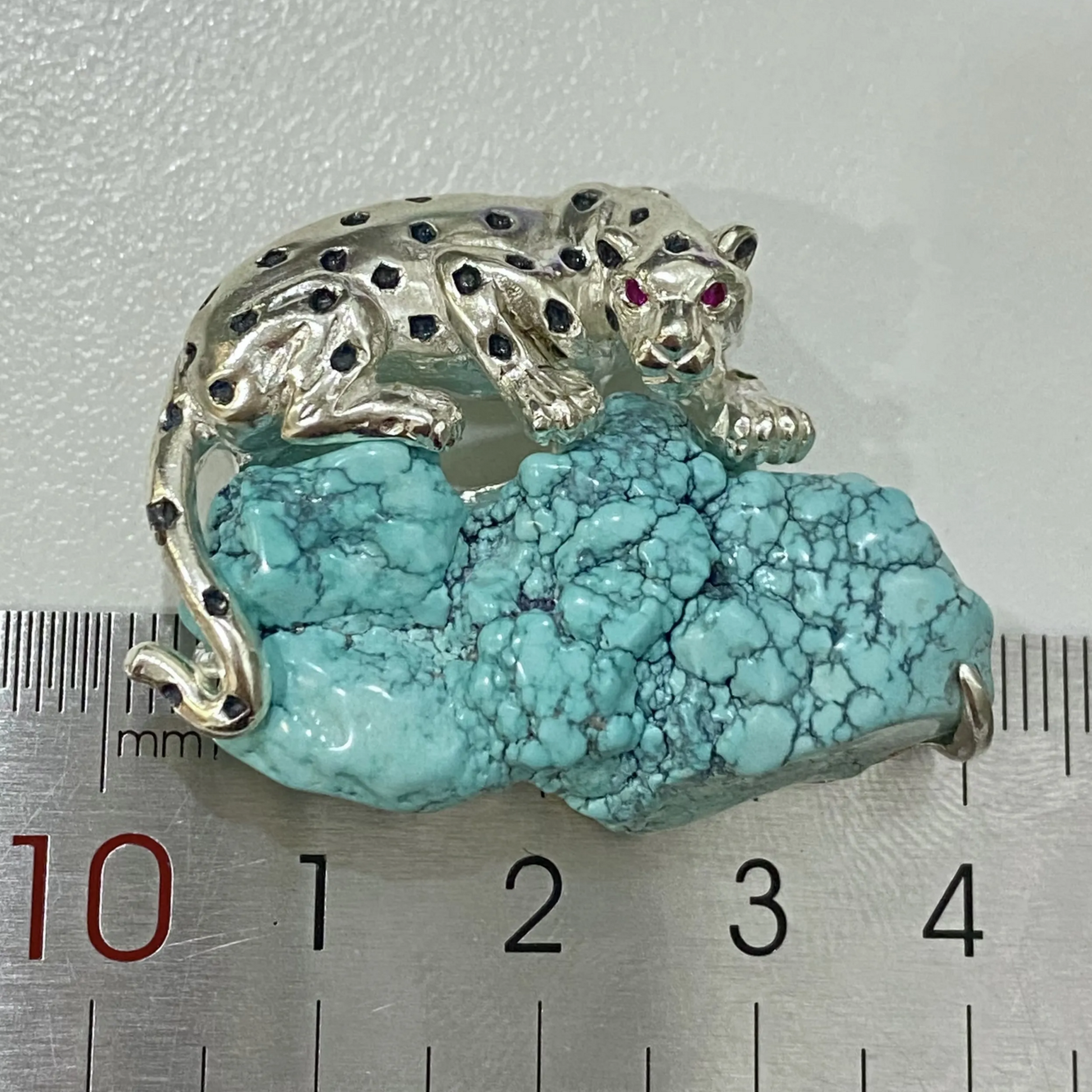 925 Silver Leopard Brooch Pendant | Turquoise & Ruby Animal Jewelry | Handmade Totem Gift for Strength & Courage
