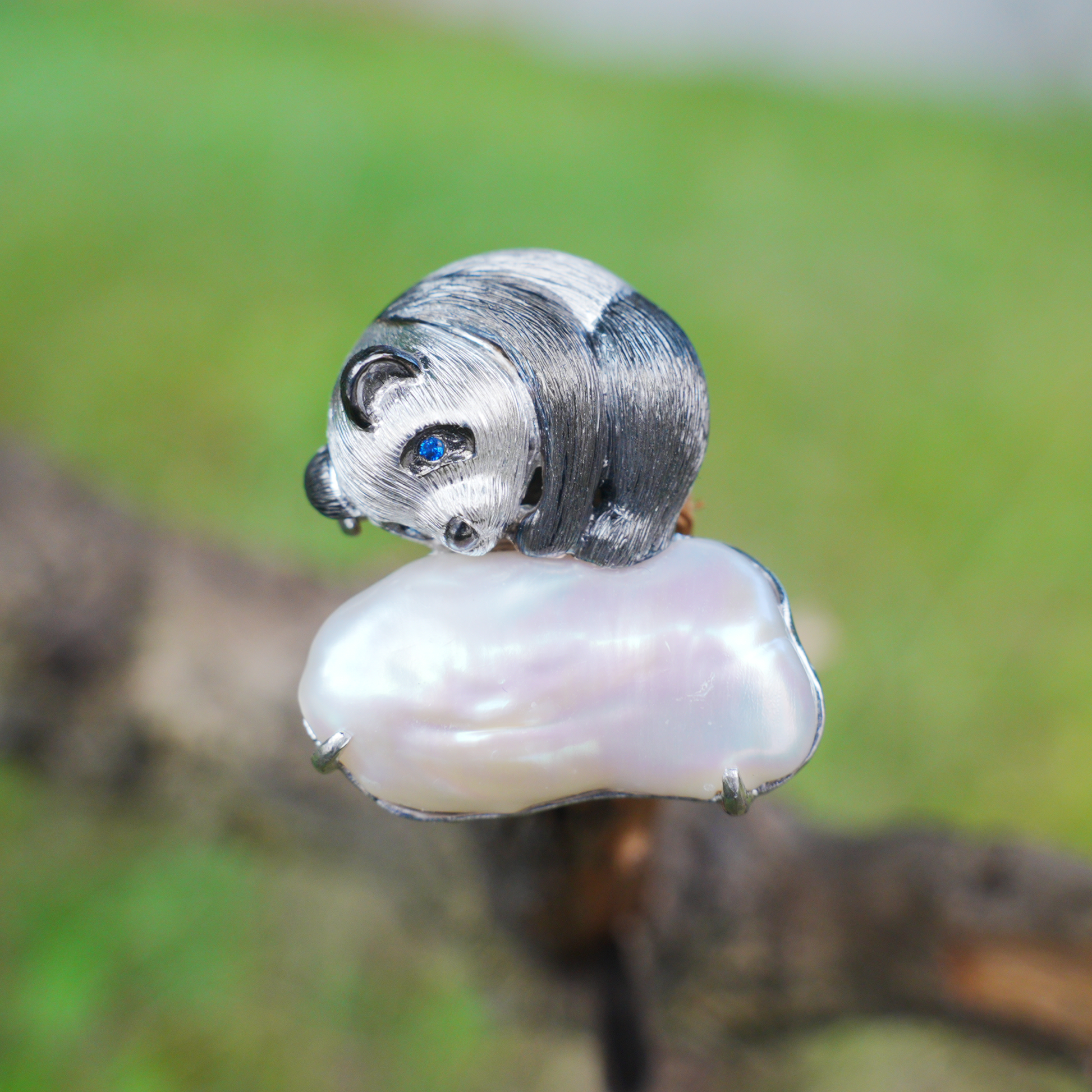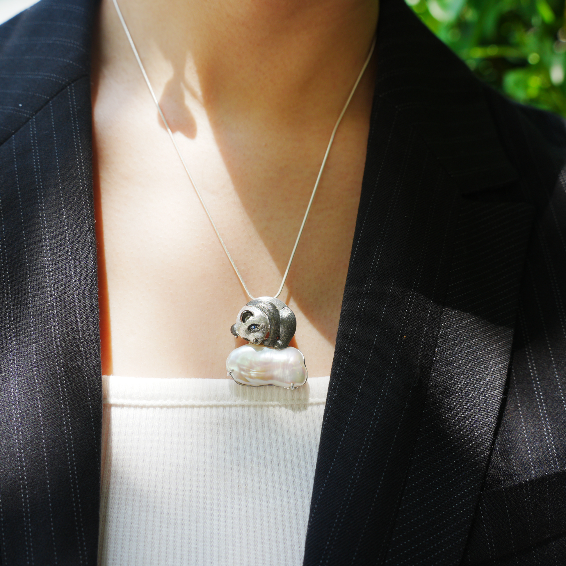 Crafted from 925 sterling silver and a natural baroque freshwater pearl, this piece depicts a peaceful panda resting upon a luminous pearl cloud — a symbol of healing, protection, and inner peace.