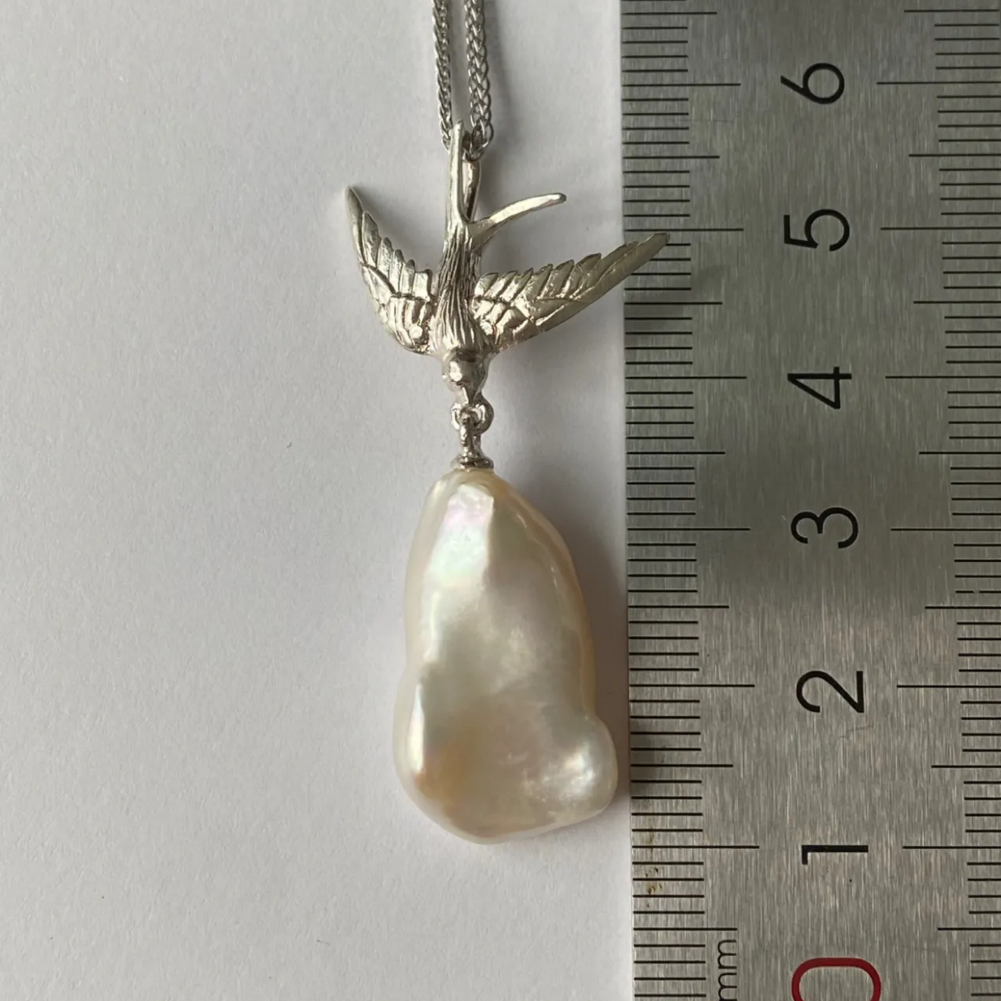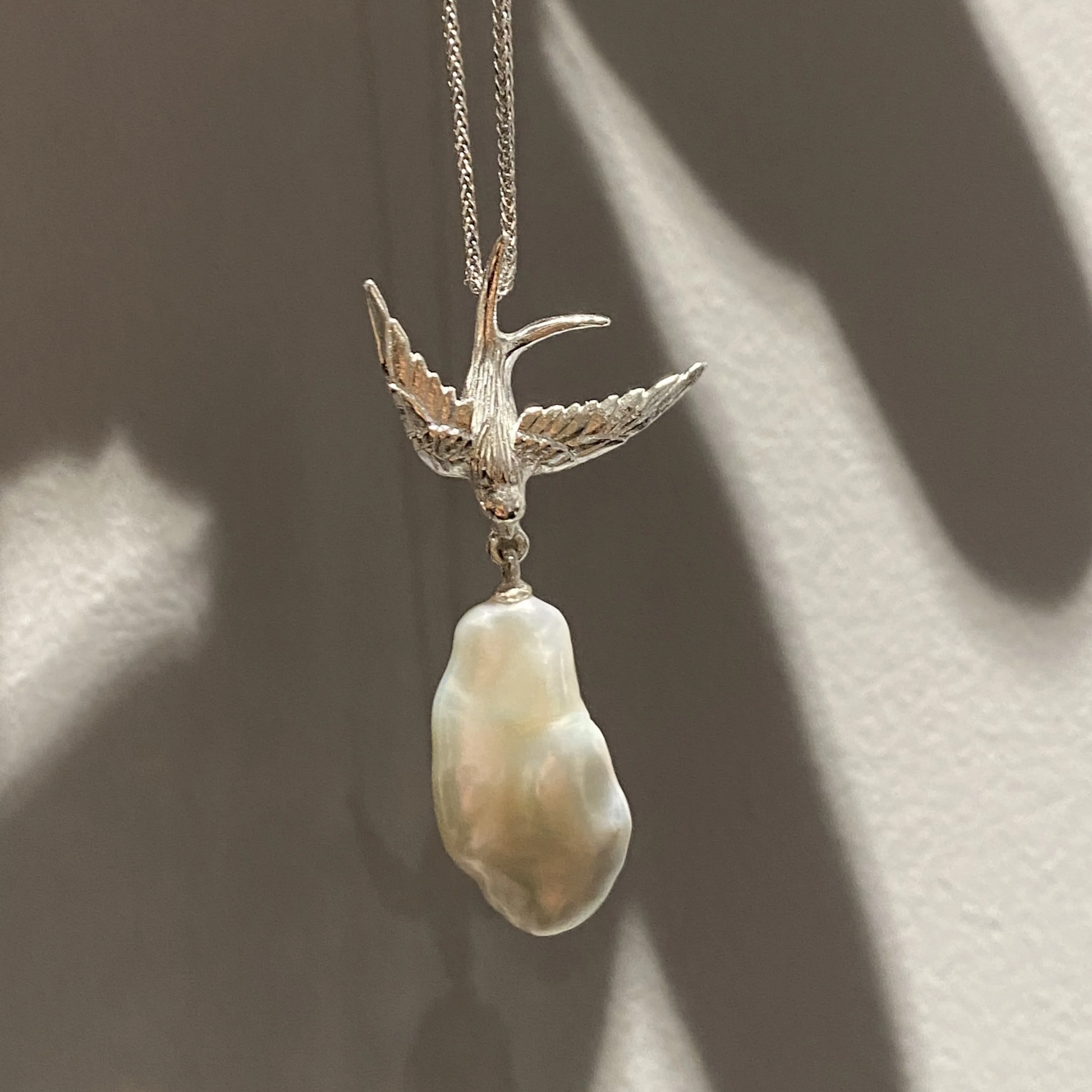 A swallow carved in 925 sterling silver, soaring mid-flight, carries a single natural baroque pearl.