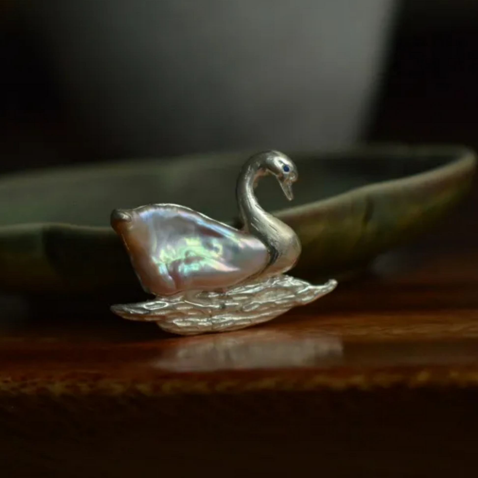 925 Silver Swan Pearl Brooch Pendant | Handmade Animal Jewelry | Sapphire Eye Bird Pin | Gift for Mom or Romantic Partner
