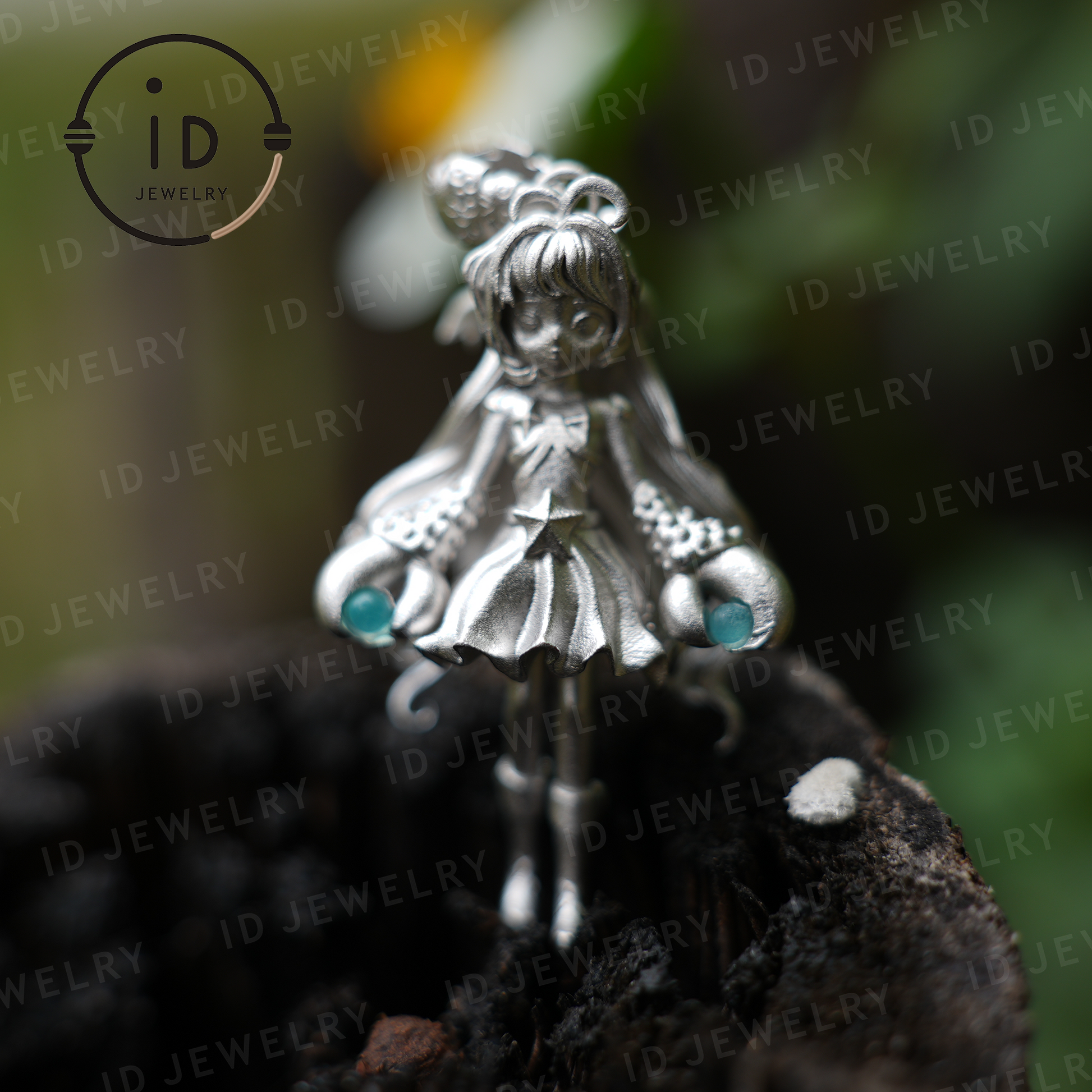 This pendant is finely crafted in 925 silver, featuring a girl with a rippling skirt and flowing hair. Her arms bear two crab claw-shaped guards inset with natural amazonite, echoing the sea’s call — both a symbol of emotion and a battle stance. Her silhouette rises like gentle waves, tender yet sharp and unyielding.