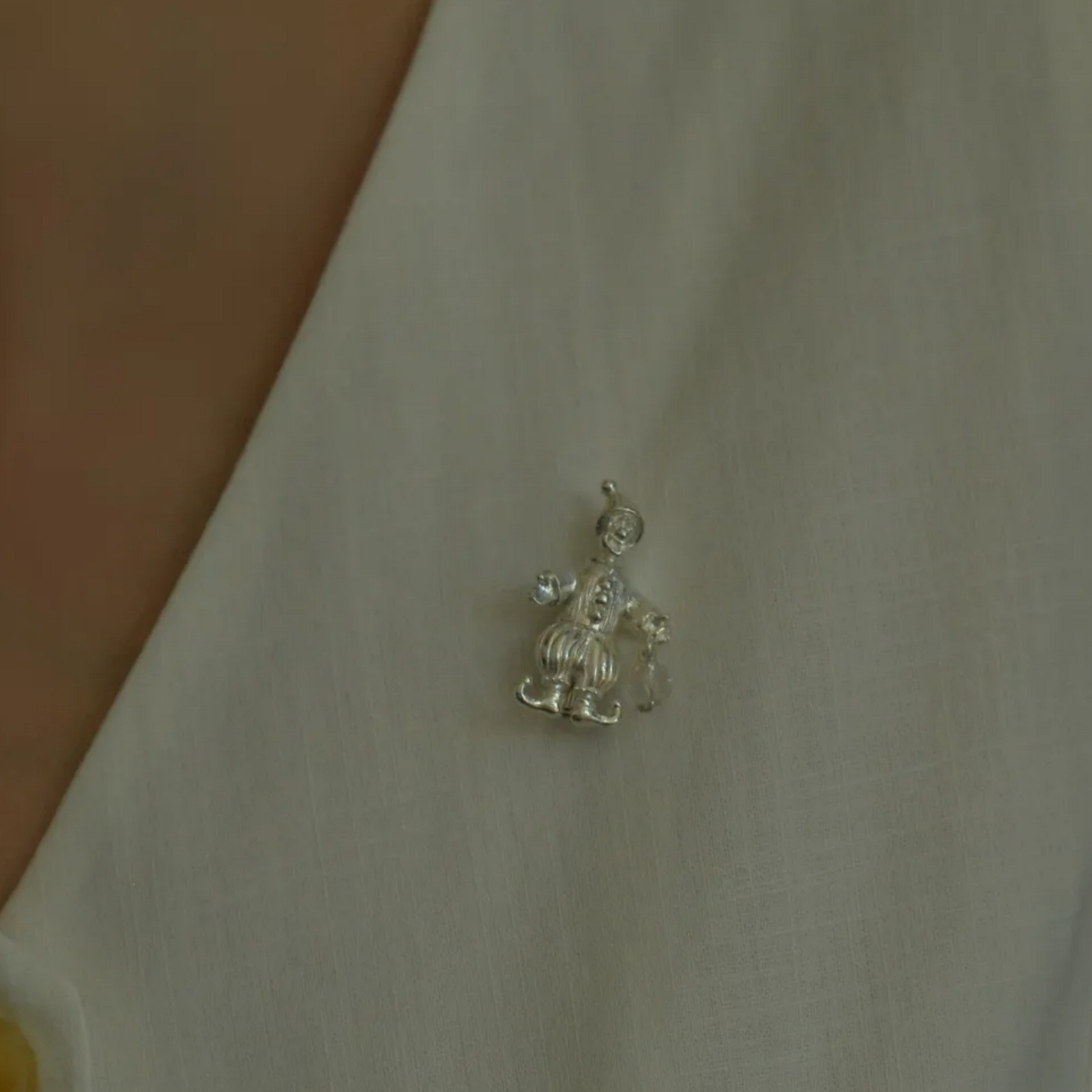 This handcrafted clown brooch pendant is made from 925 sterling silver, detailed with a faceted crystal accent.