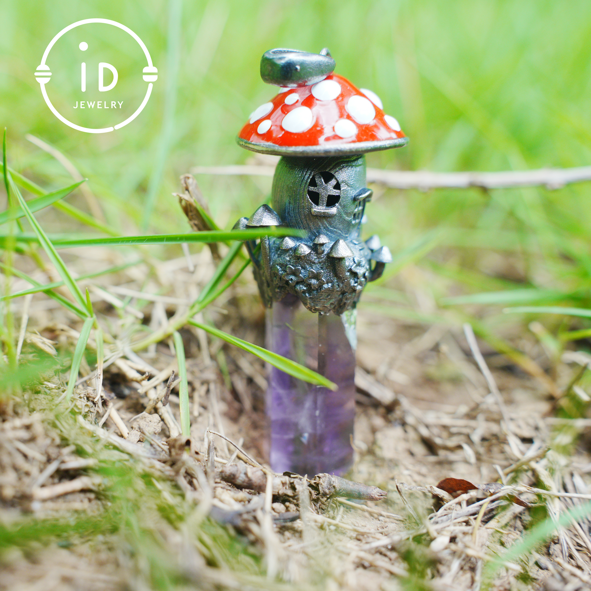 The amethyst at the bottom is cut and polished natural raw stone, resembling a translucent crystal pillar