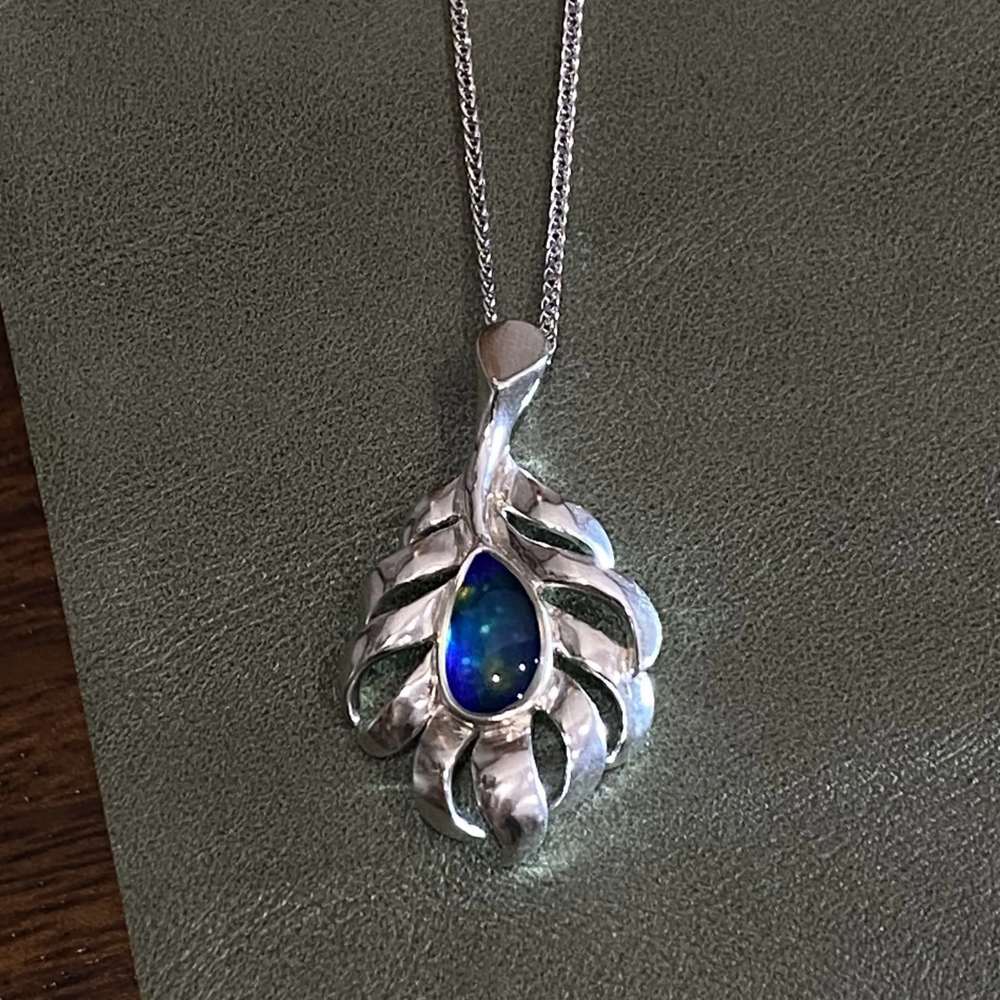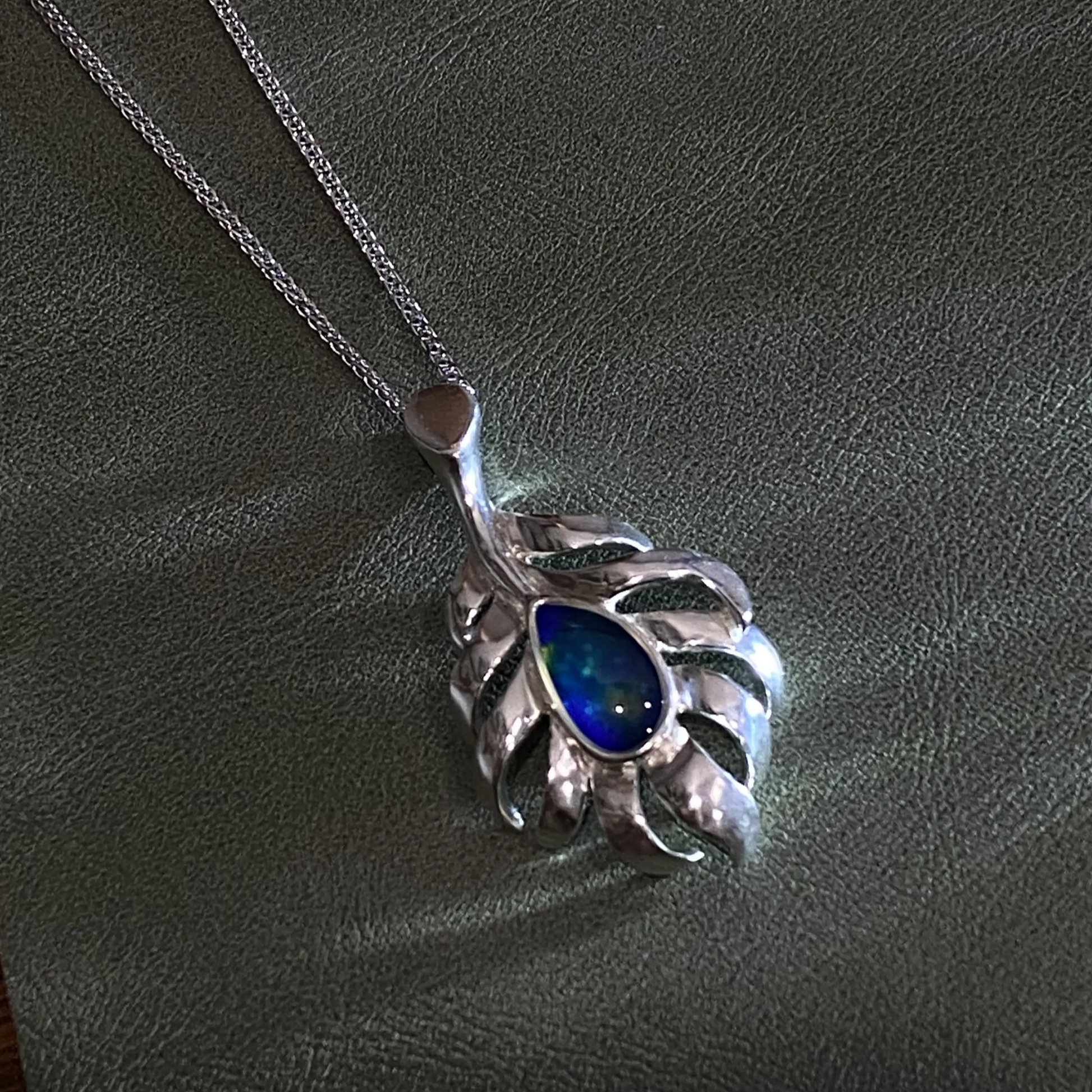 This Feather Pendant Necklace is handcrafted in 925 sterling silver, featuring a hand-painted enamel teardrop in shades of blue and green.