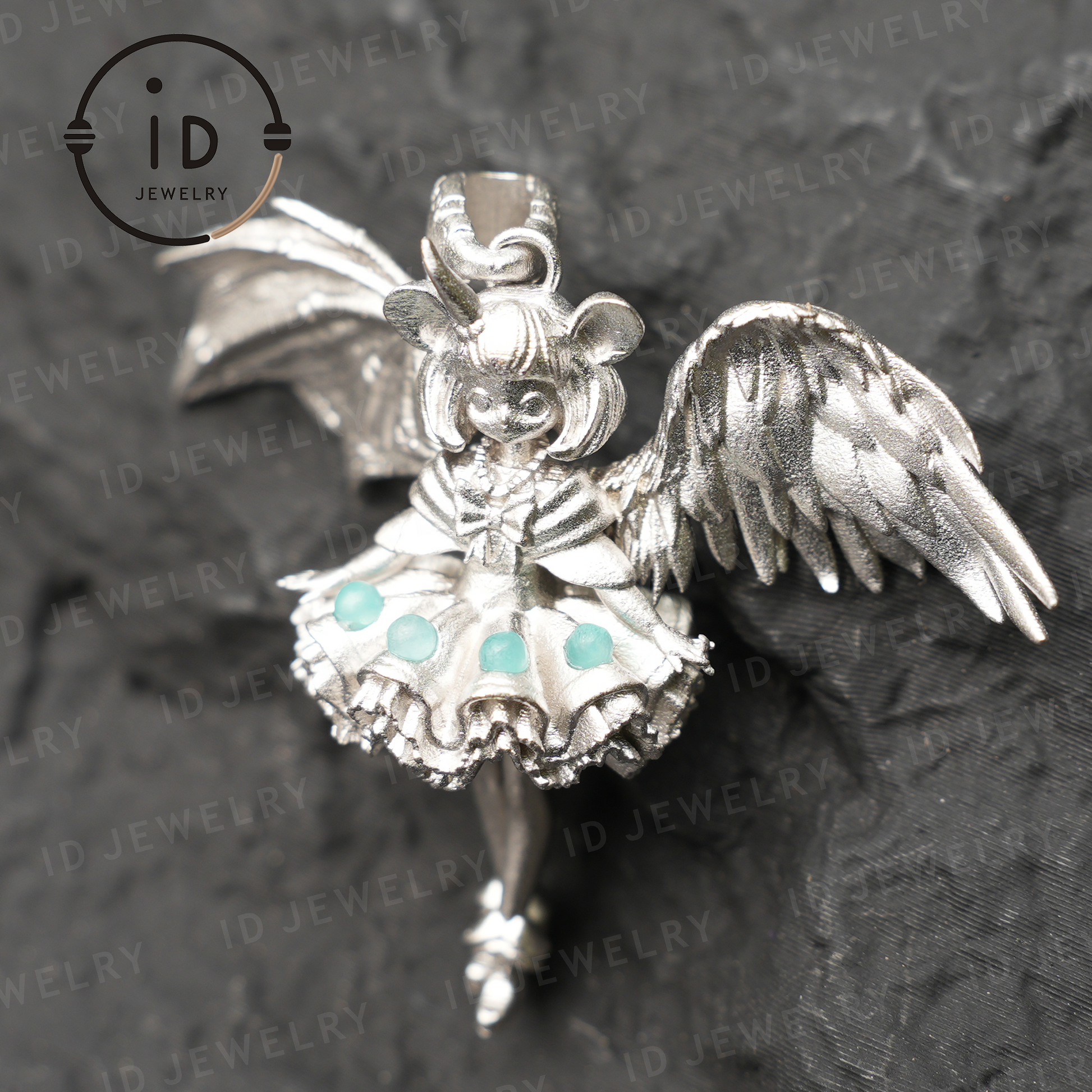 This pendant delicately crafts a winged girl figure in 925 silver, adorned with amazonite stones that sparkle like falling stars — a token from the cosmos.