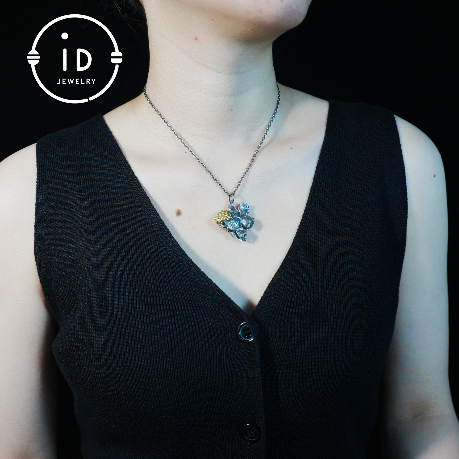 This lovingly handcrafted goldfish pendant combines natural elegance, delicate craftsmanship and symbolic depth into a poetic piece of jewelry. The oxidized 925 silver surface gives the little creature a lifelike, almost meditative presence, while the golden brass details highlight the distinctive head shape. An agate stone embedded in the body adds significance as a stone of inner clarity. Worn as a necklace, this piece serves as a gentle reminder to remain centered even in turbulent times – a quiet talisman for mindfulness and balance.
