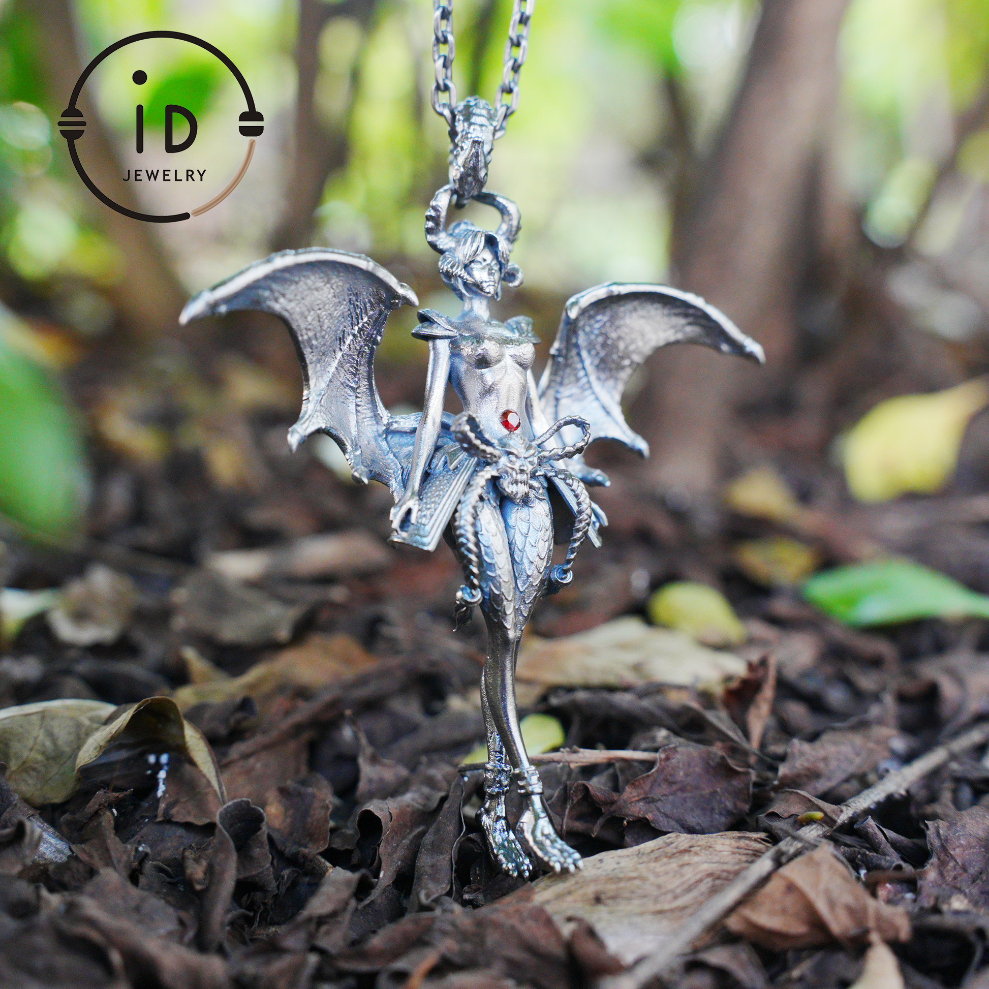 Gothic Garnet Demon Goddess Pendant Necklace – 925 Silver Fallen Angel Amulet – Dark Aesthetic Occult Jewelry for Witches & Cosplay