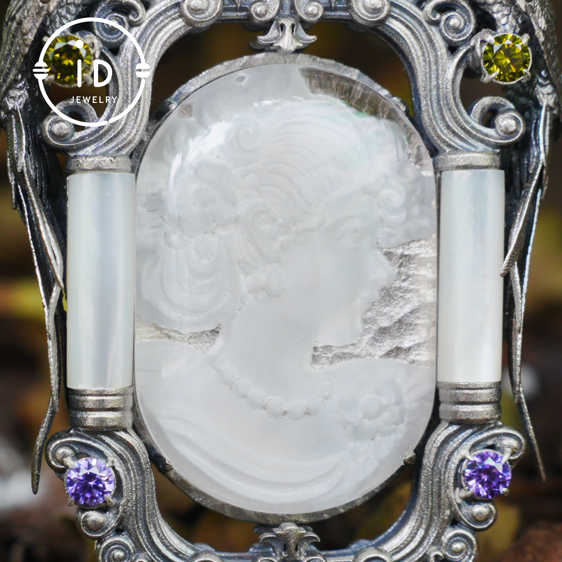 Handmade 925 Silver Victorian Cameo Necklace | Baroque Pendant with Two Parrots | Girl Relief in Rock Crystal | Vintage Craft