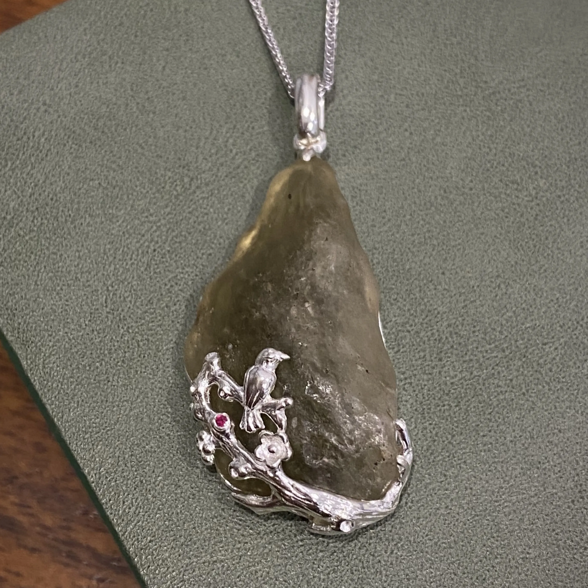 This handcrafted Joy on the Plum Branch Pendant features Libyan Desert Glass set in 925 sterling silver, delicately carved with a magpie and blooming plum branch.