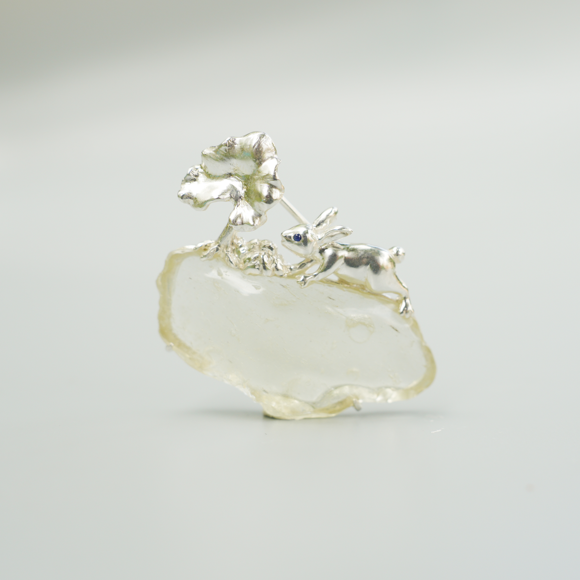 A finely sculpted silver rabbit leaps gracefully across a raw piece of Libyan Desert Glass, accompanied by delicate silver leaves — capturing a moment of curiosity and hope beneath an imagined lunar glow.
