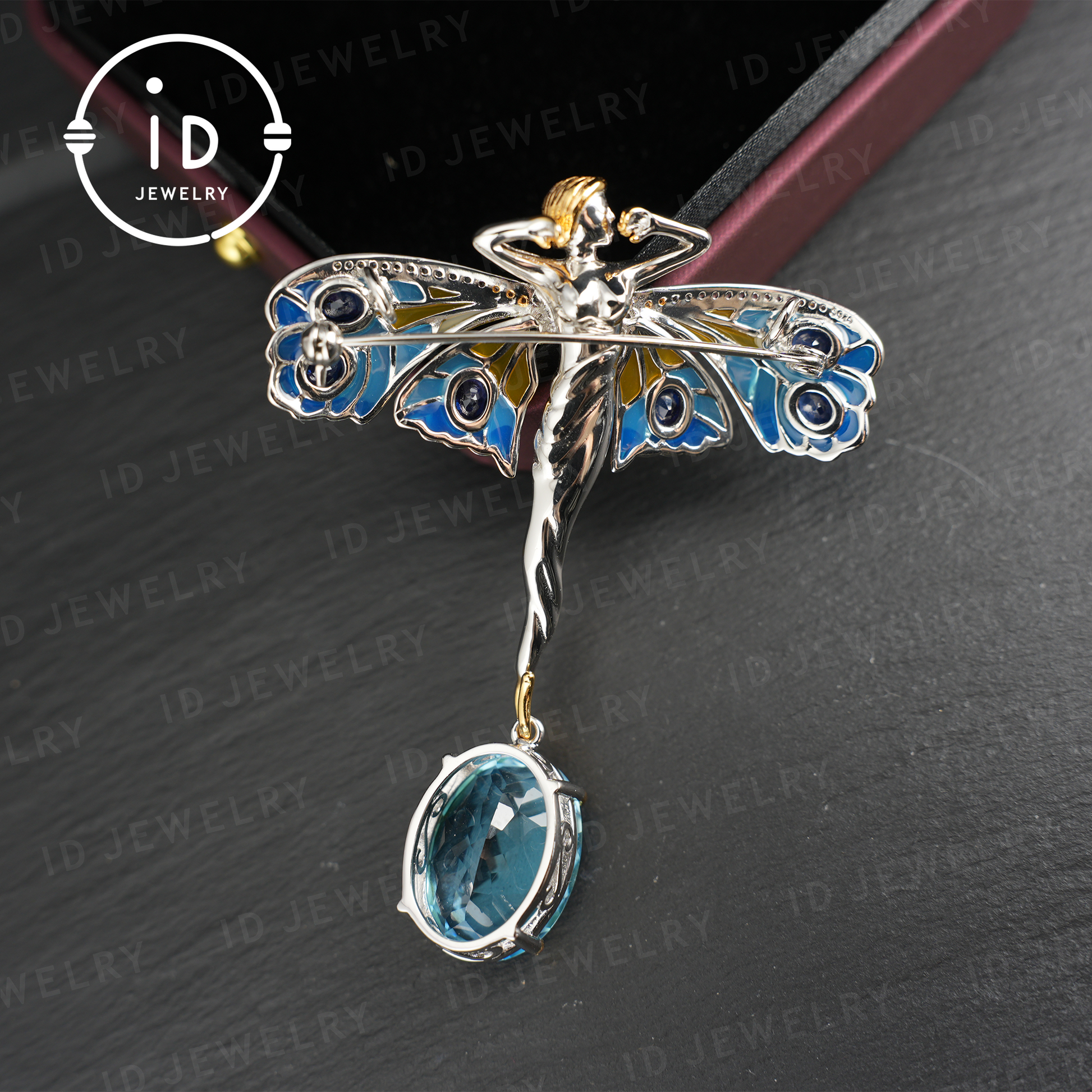 This exquisite brooch is crafted from high-quality sterling silver (925), elegantly finished with gold-plated 18K gold. The centerpiece is a stunning natural topaz, artistically set in an intricately detailed fairy design with exquisite wings.