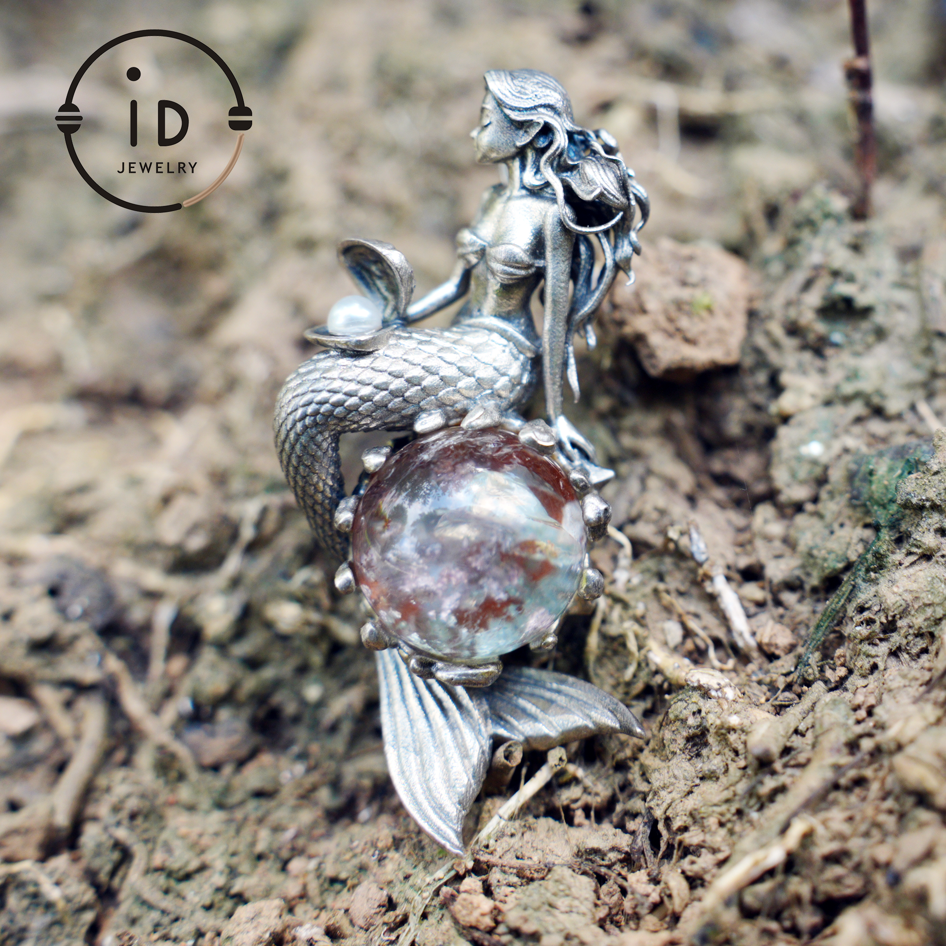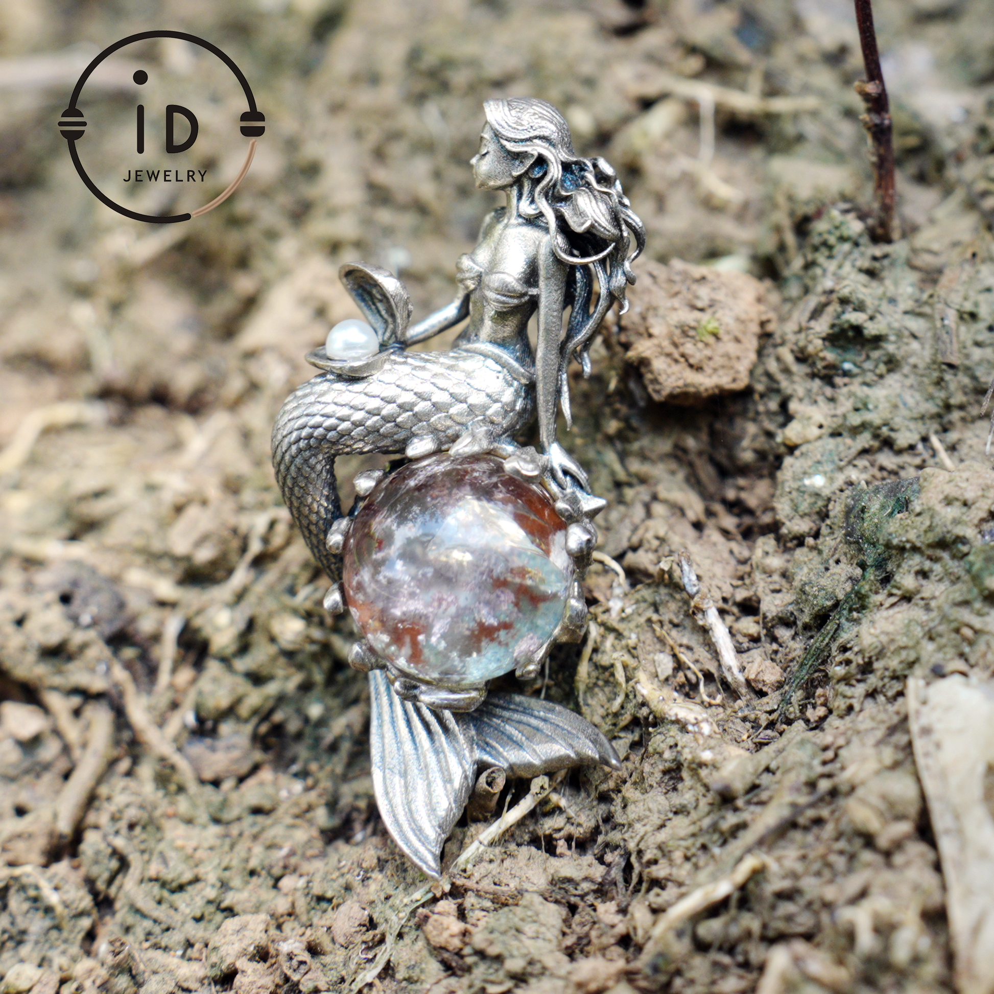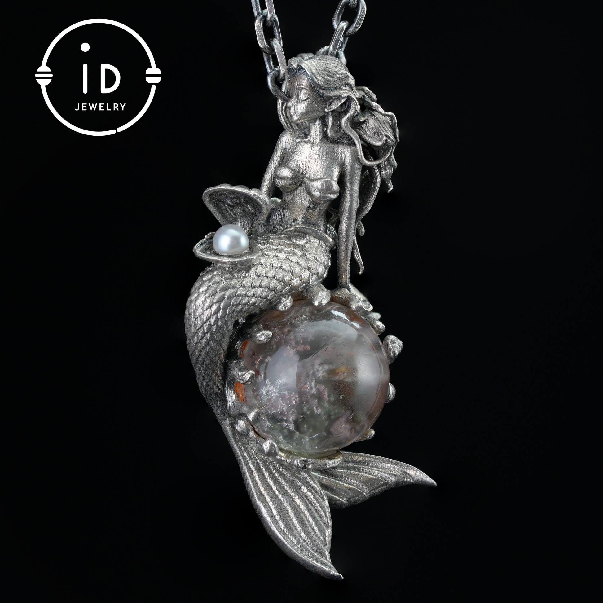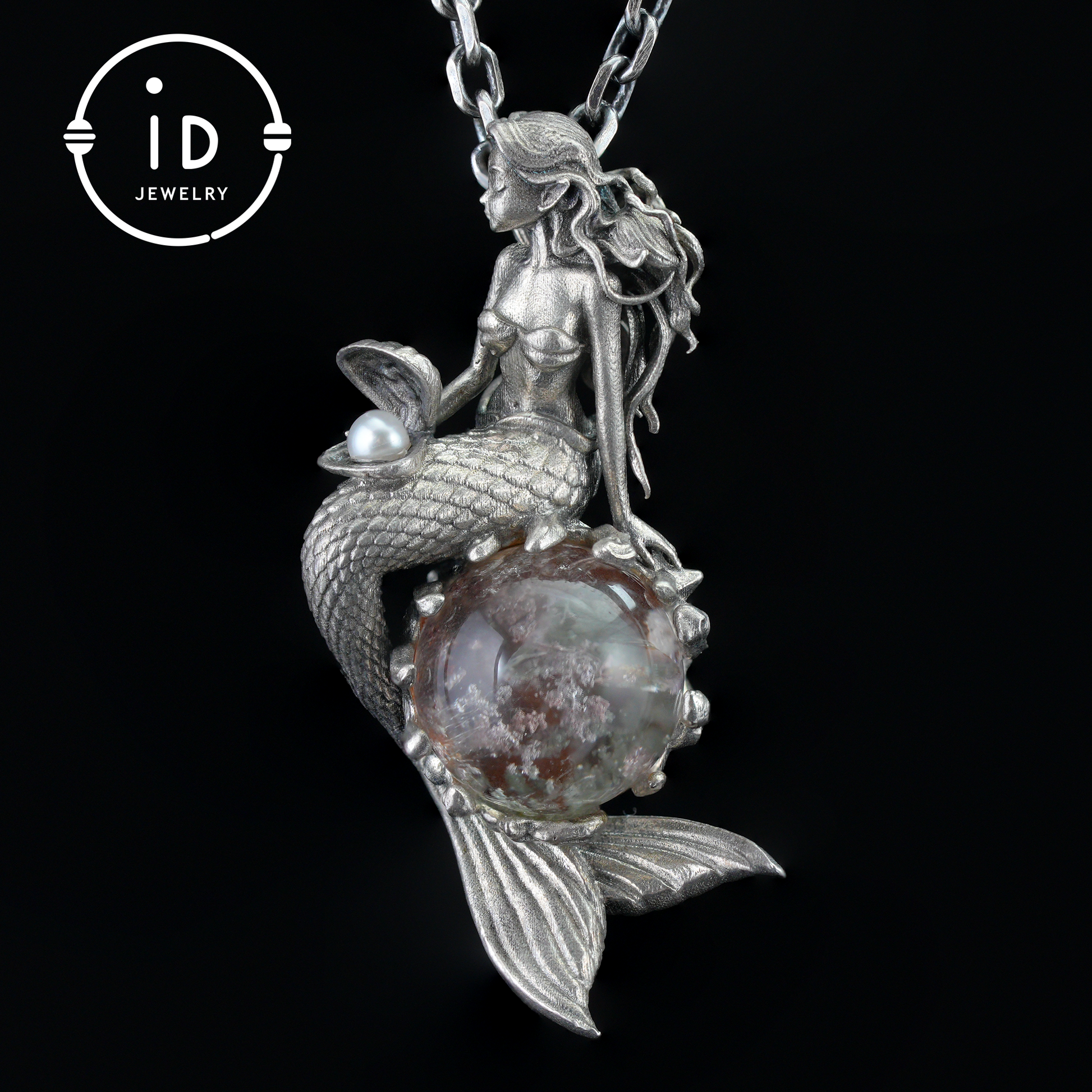 Mermaid Wish Talisman Pendant with Ghost Stone and Pearl, Fantasy Ocean Jewelry, Handcrafted Mythical Sea Spirit Amulet Necklace