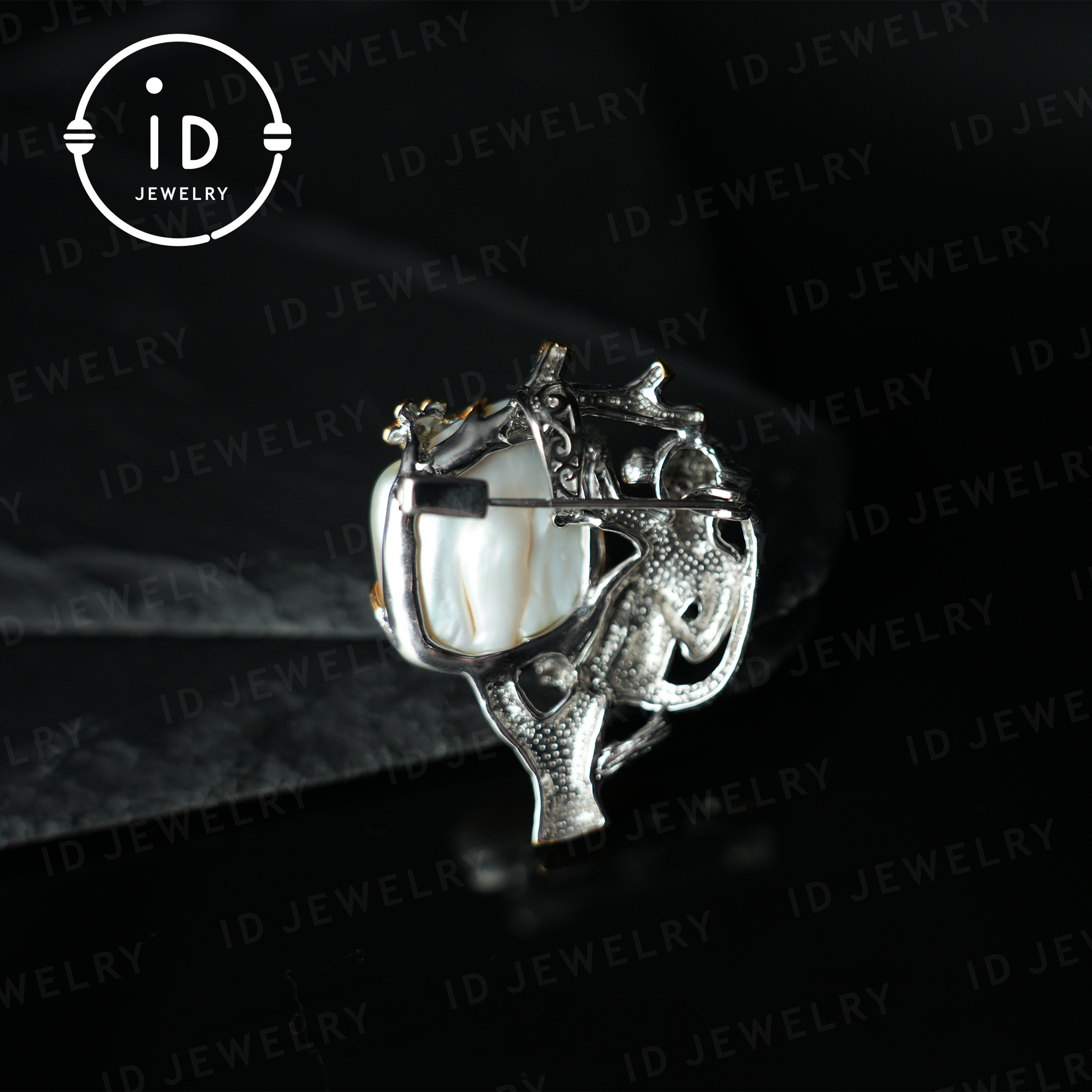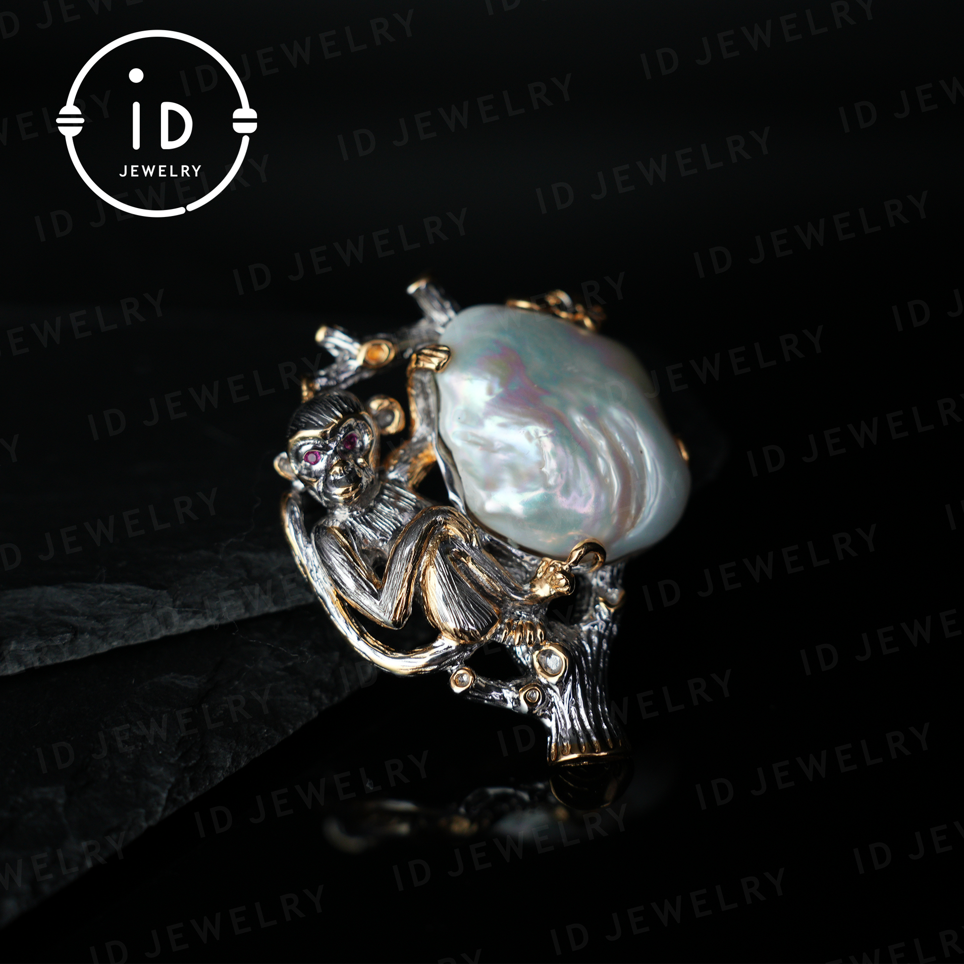 Made from a shimmering baroque freshwater pearl combined with 925 silver and fine 18K gold plating. The detailed design of the monkey climbing a tree perfectly brings together liveliness and artistry.