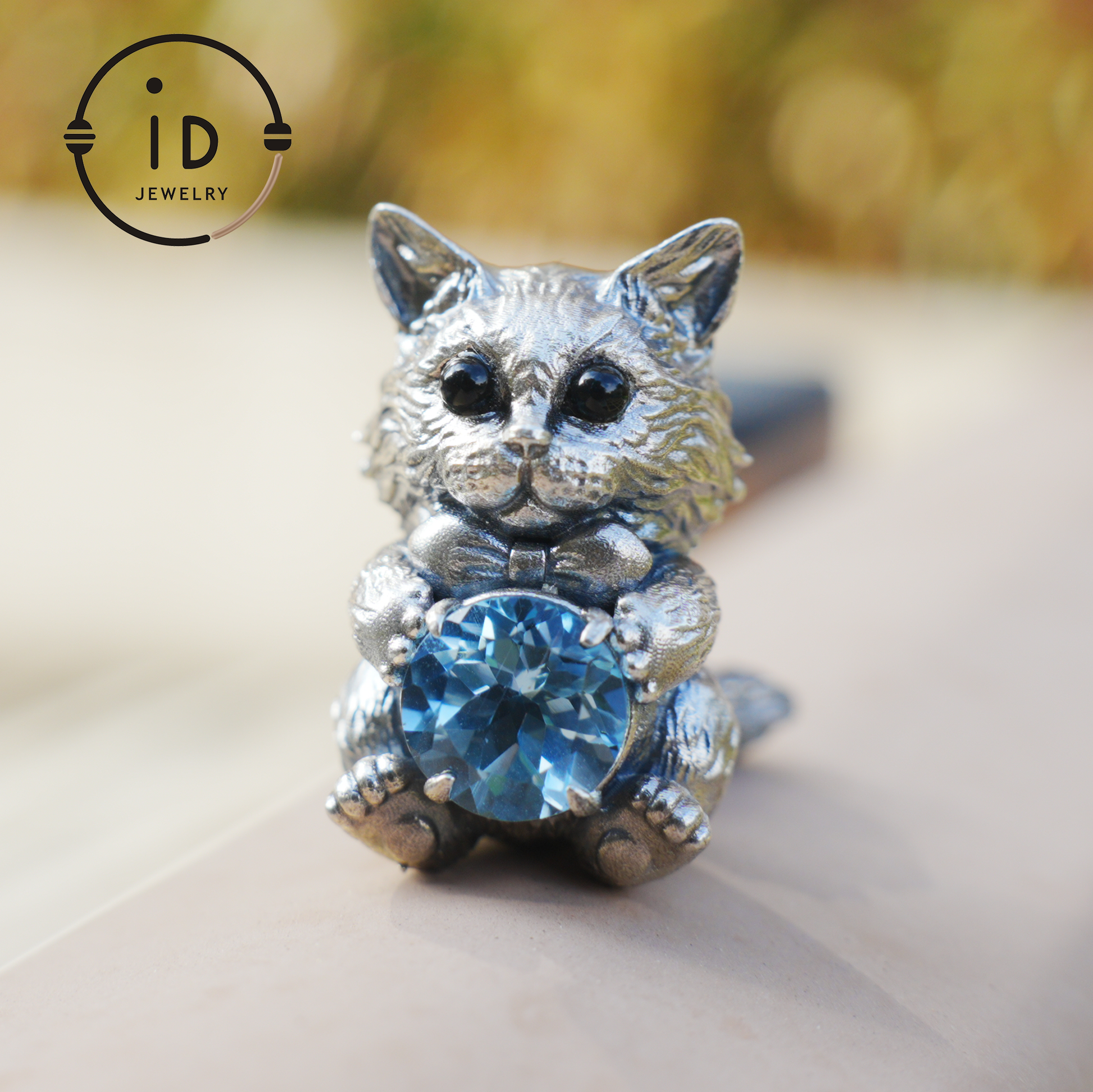 A charming cat holds a sparkling blue topaz — symbolizing gentleness, balance, and calm — while its movable tail adds a whimsical touch of life and joy.