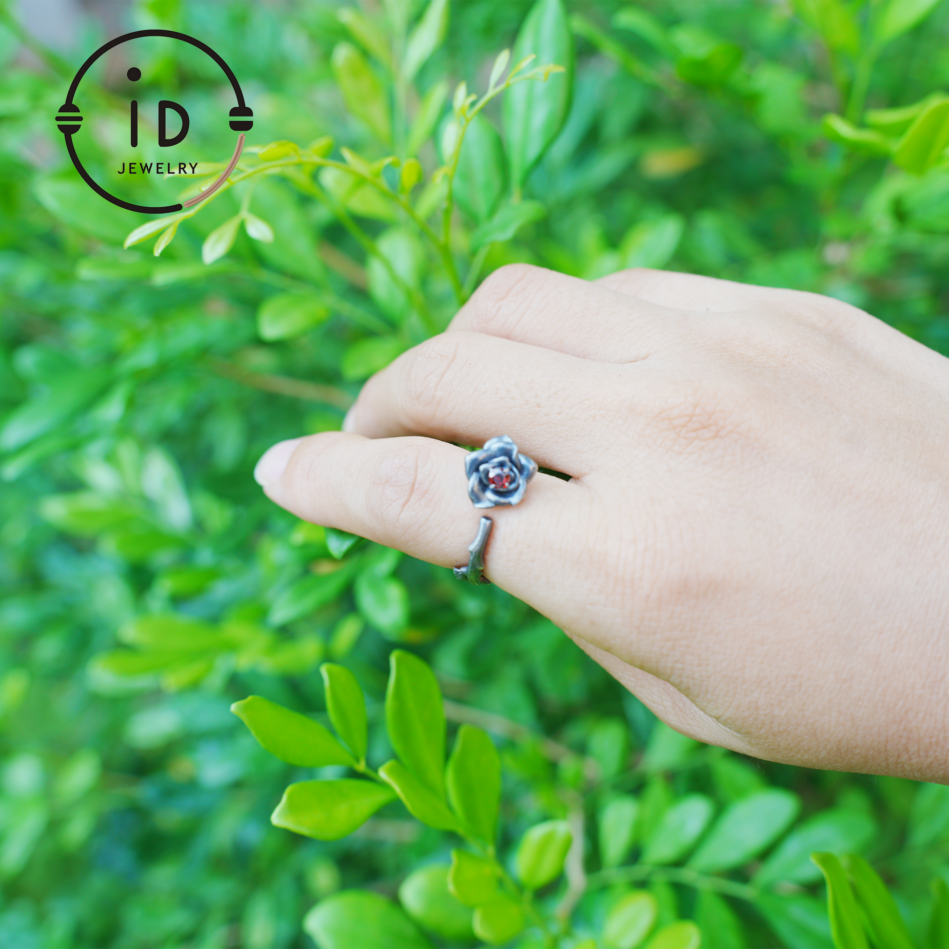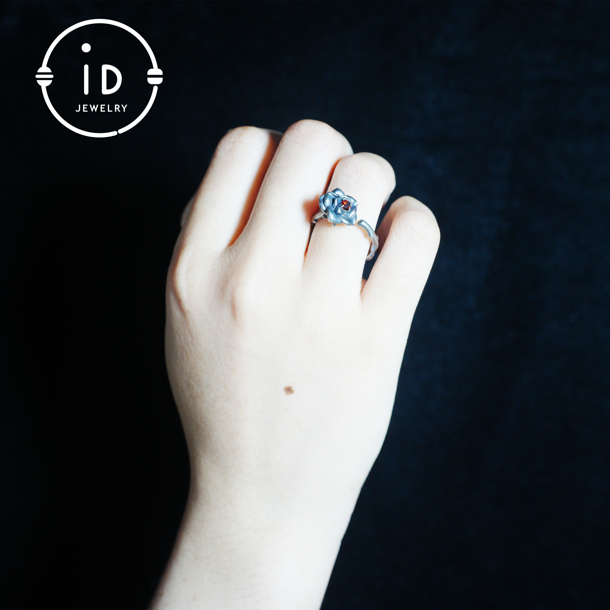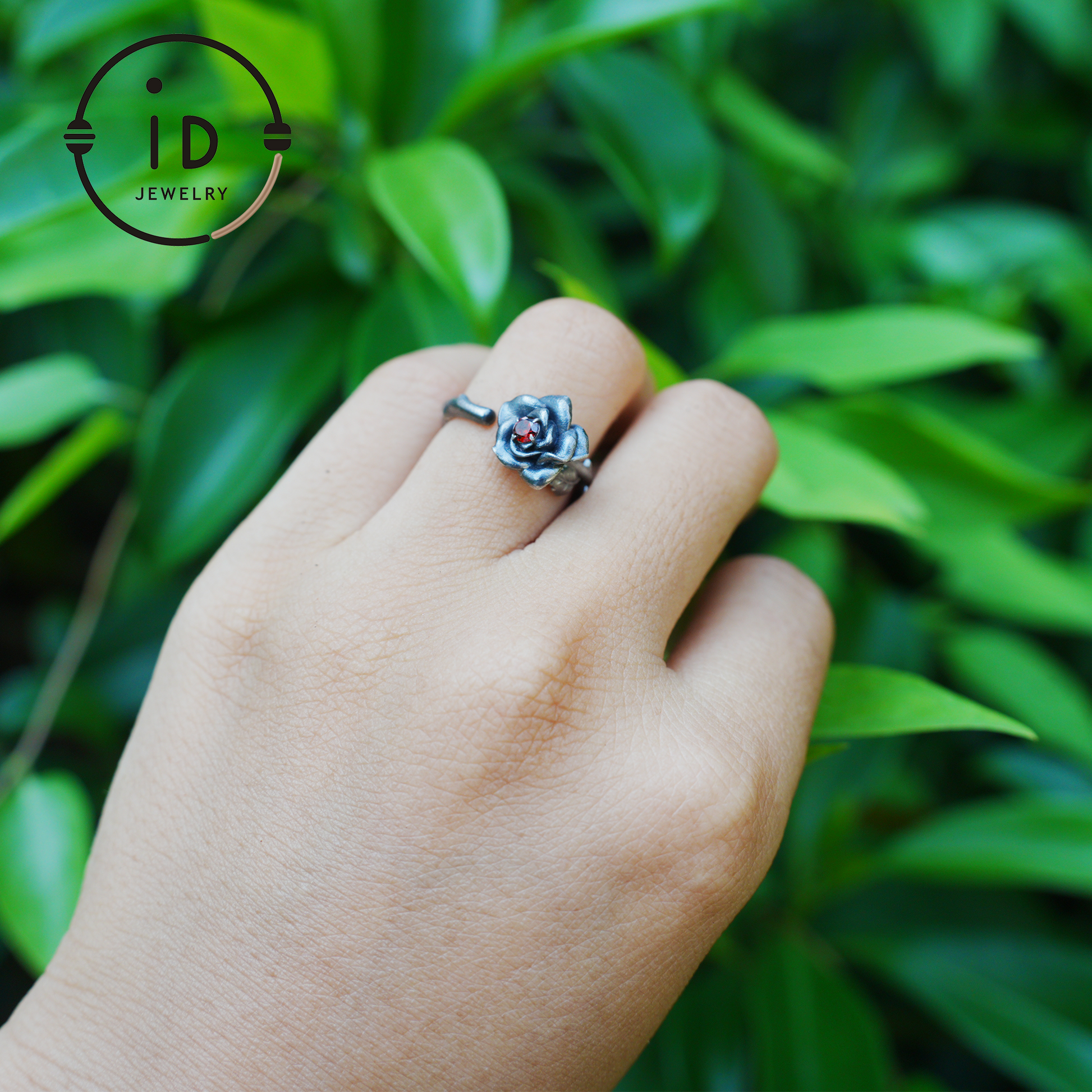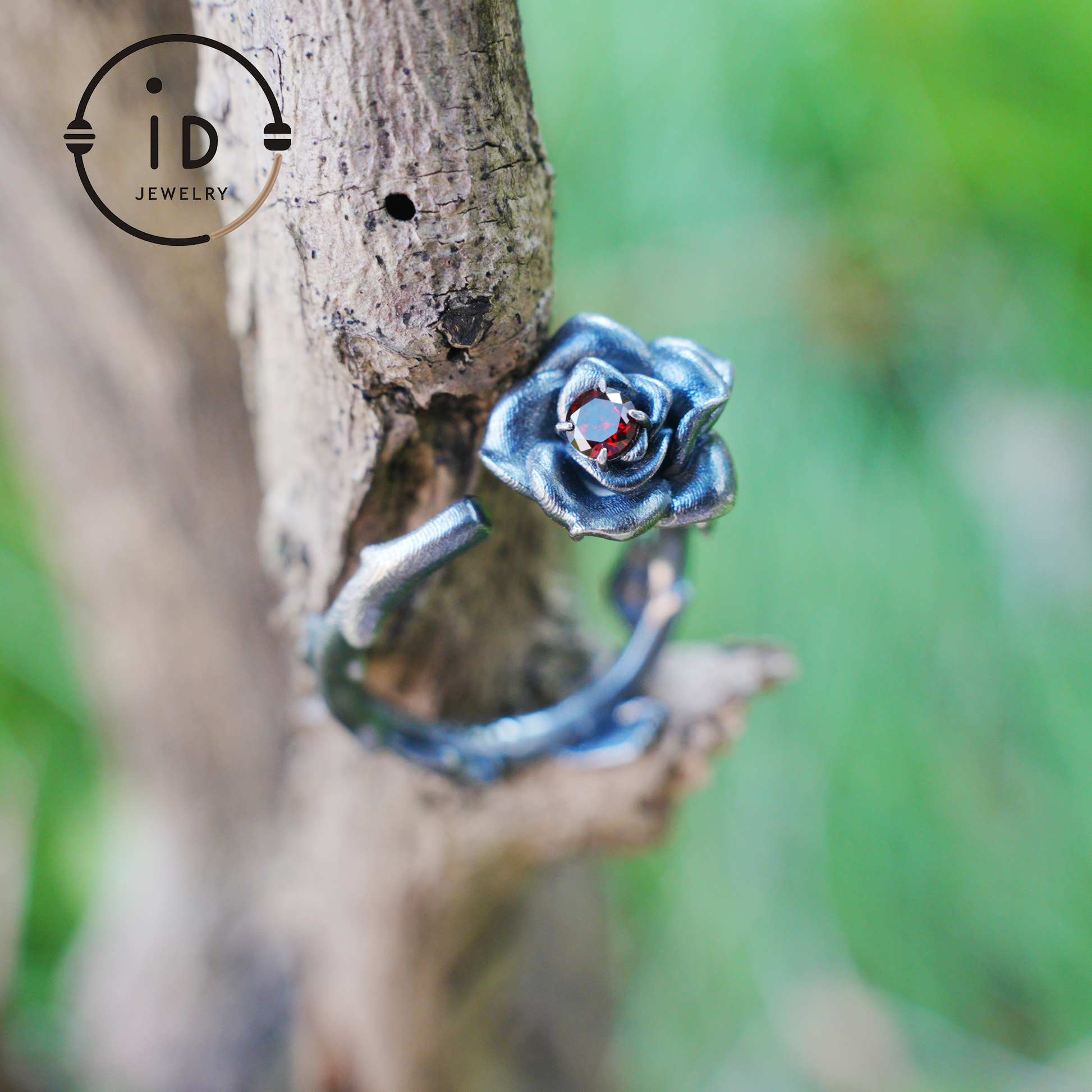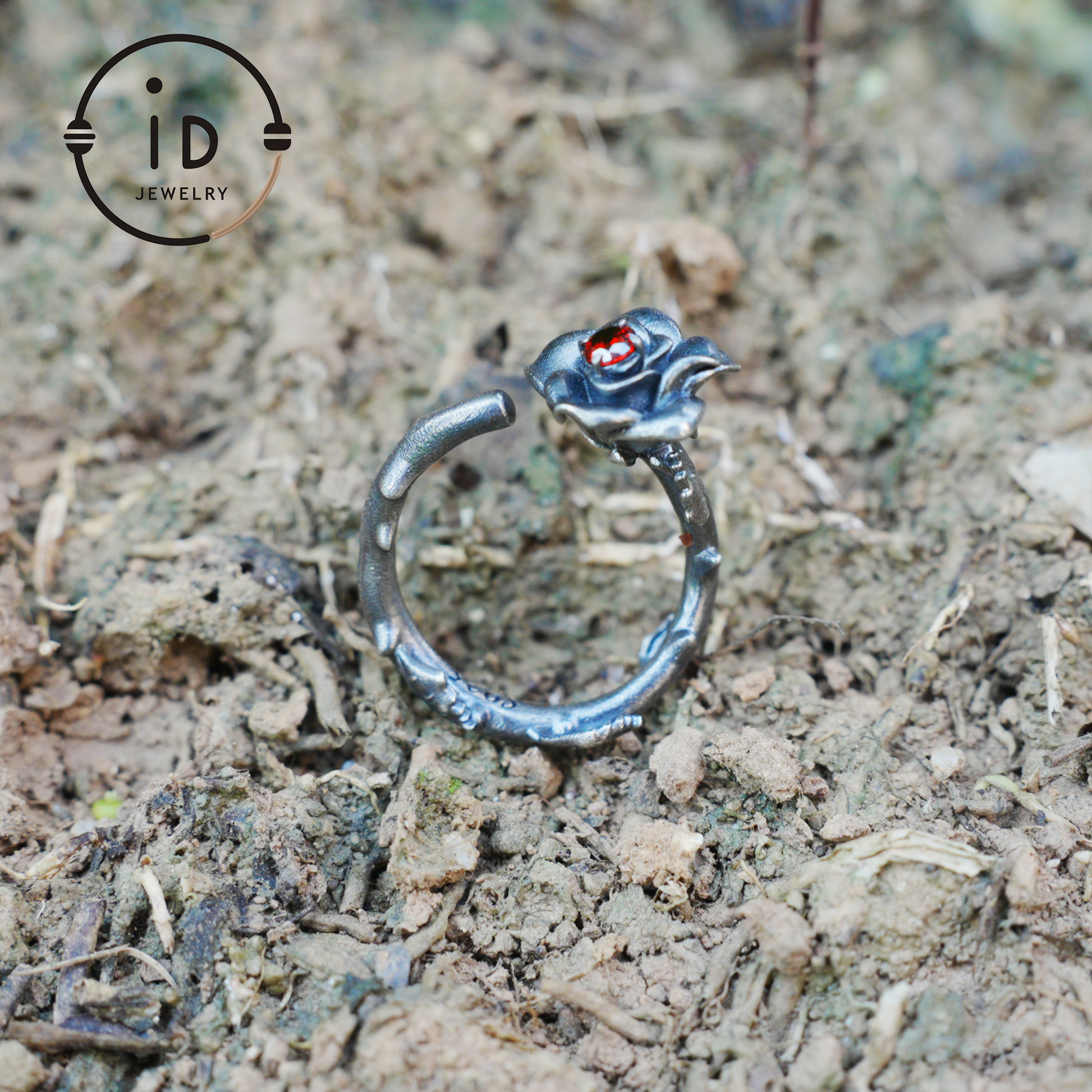 The upper ring band blossoms into petal-like silverwork, with a deep red stone at the heart—