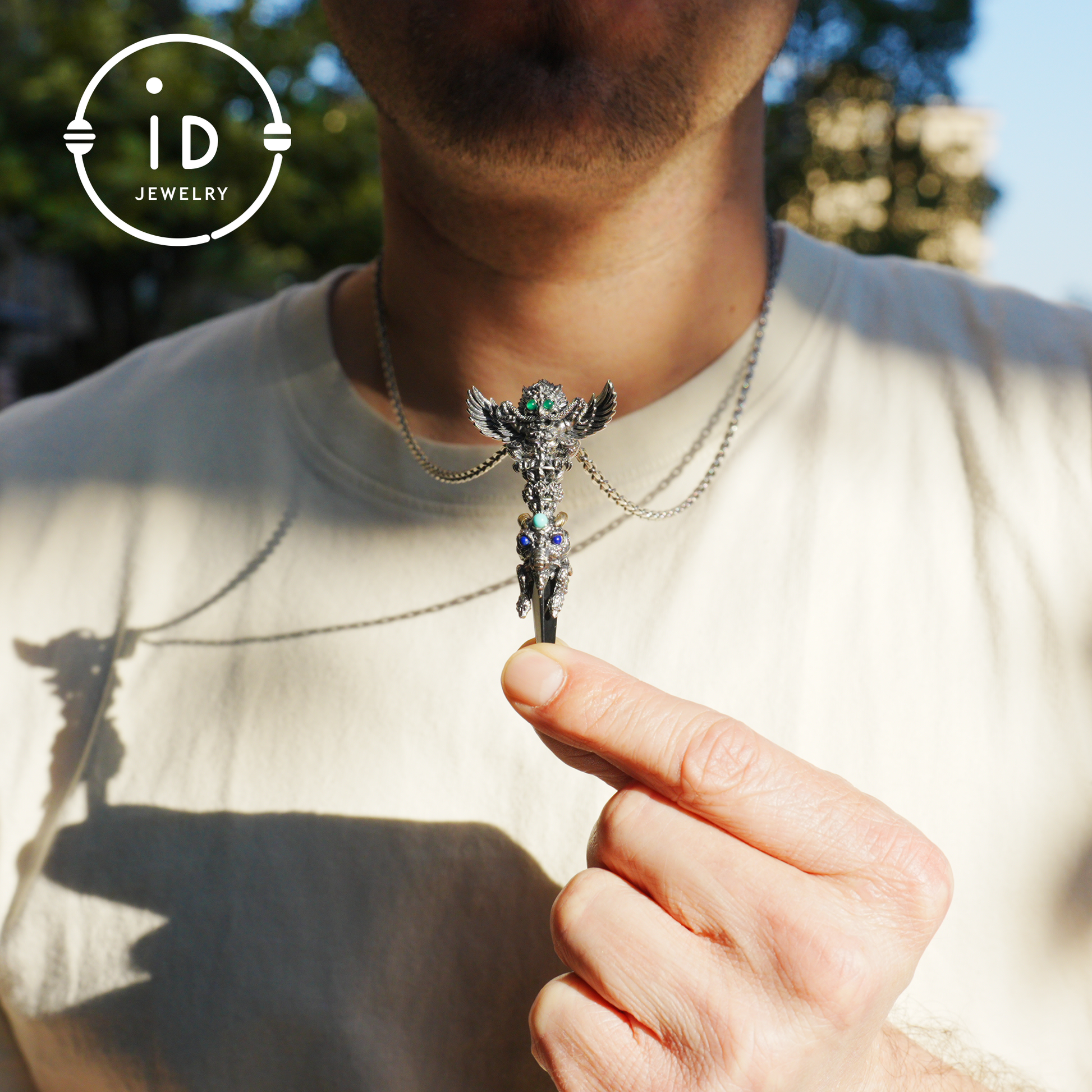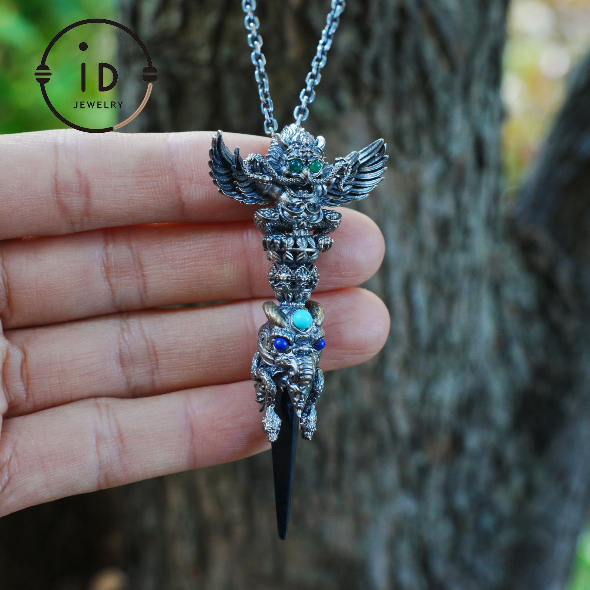 This handcrafted totem pendant made of oxidized 925 silver combines symbolic structure with archaic strength. The combination of black onyx, green chalcedony, lapis lazuli, and turquoise creates a balance between darkness and light, movement and stillness. Worn as a pendant, it functions as a personal talisman, supporting presence, focus, and inner stability. It is ideal for those who choose jewelry as a reflection of inner awareness rather than pure decoration.